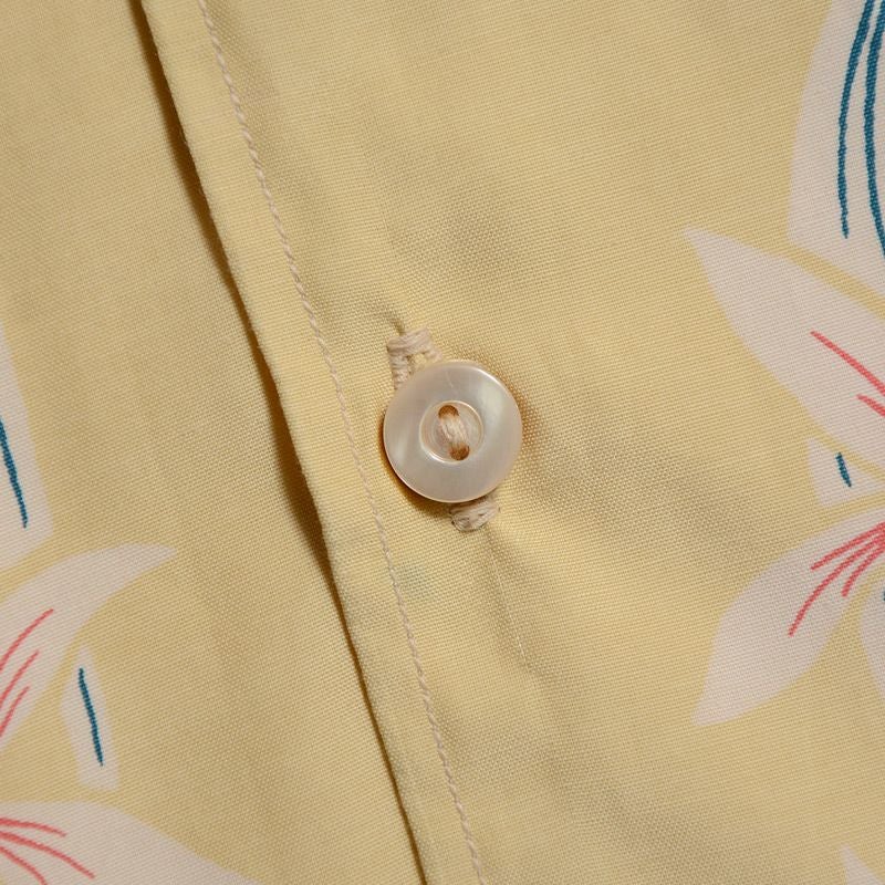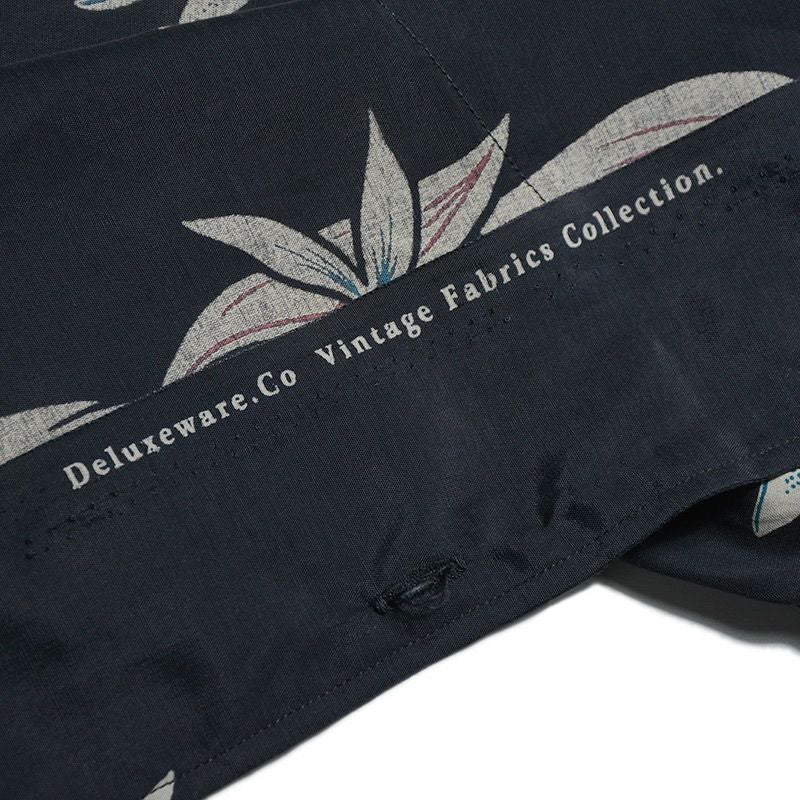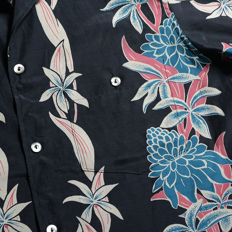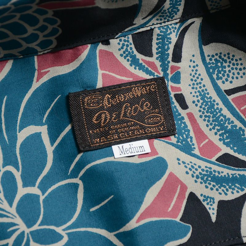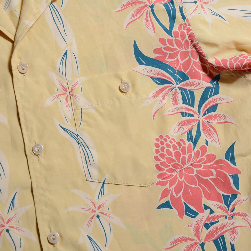 福井県福井市の旧式シャトル織機を使用し製造したフィラメントレーヨン+コットンの唯一無二の素材と、4色着抜捺染により創り上げたデザイン素材が特徴です。この4色着抜捺染とは、生地素材を先に染めてから、プリントするデザイン部だけを抜染(ブリーチ)し抜染した部分に多色をプリントして行くと言うもの。現代の多くはこのプリントを自動機またはインクジェットプリンターなどで行いますが、生地表裏の区別が付きにくいほど丁寧に仕上げられたプリントや生地は必ず職人の手で創られています。国内1社の旧式レーヨン織機と国内捺染プリント職人が協力し技術の末にこのハワイアンシャツは誕生しました。このAL-11をもって旧式織機によるファブリックが消滅するため、将来のヴィンテージと成り得る最後の品番です。この機会をお見逃しなく。