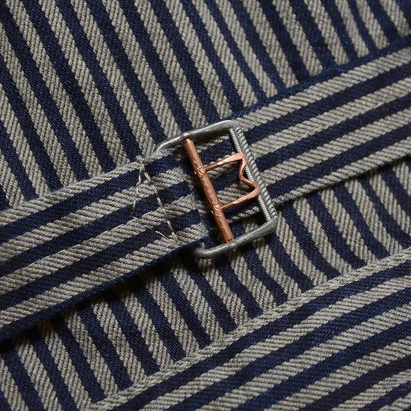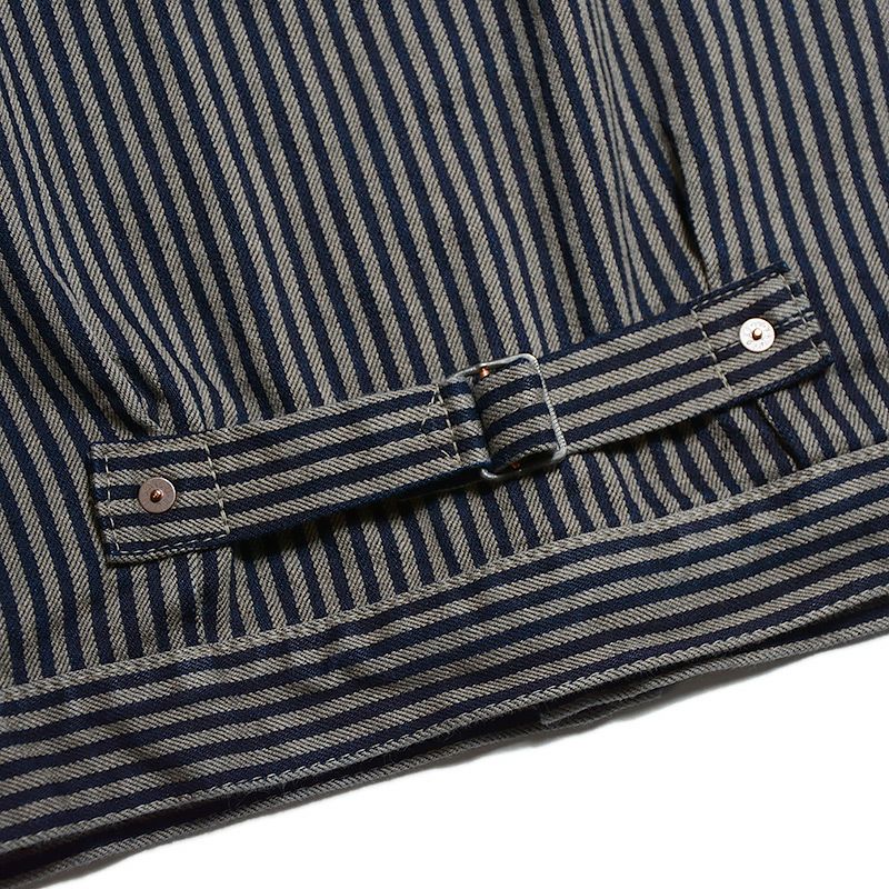 兵庫西脇の旧式織機で製造した14ozヒッコリーデニム。ロープ染色インディゴ糸と2色を撚り合わせた杢糸を定数づつ並べてヒッコリーデニムを形成しています。そのため、インディゴ特有の経年変化を楽しめます。