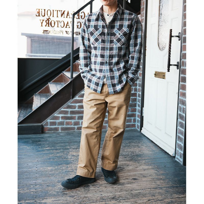 兵庫県西脇で製造したライトネル素材。厚すぎず薄すぎずの素材感は3シーズン対応の幅広い使いやすさが魅力です。オンブレ調のネイティブチェックは、旧式ドビー織機により特殊織りした複雑な組織と柄が特徴。無起毛の素材感により長いシーズン楽しめるシャツです。