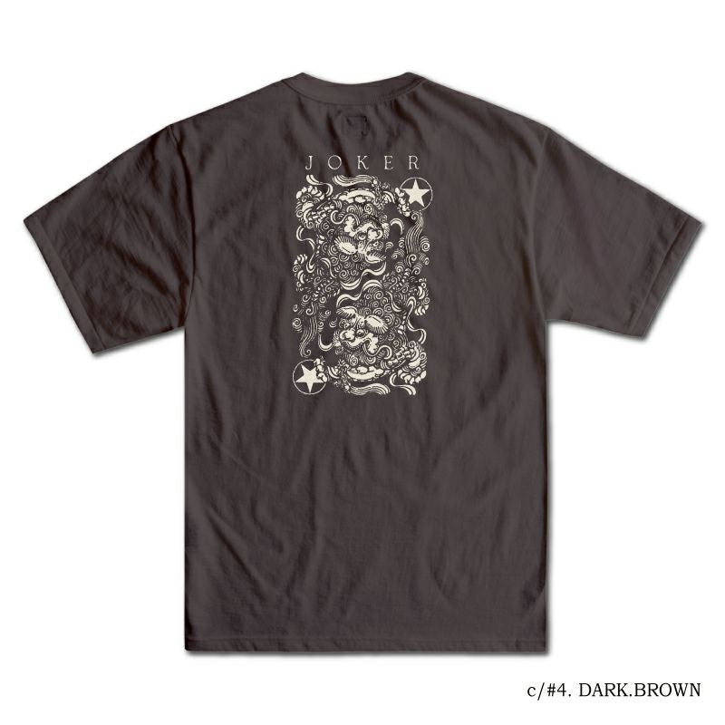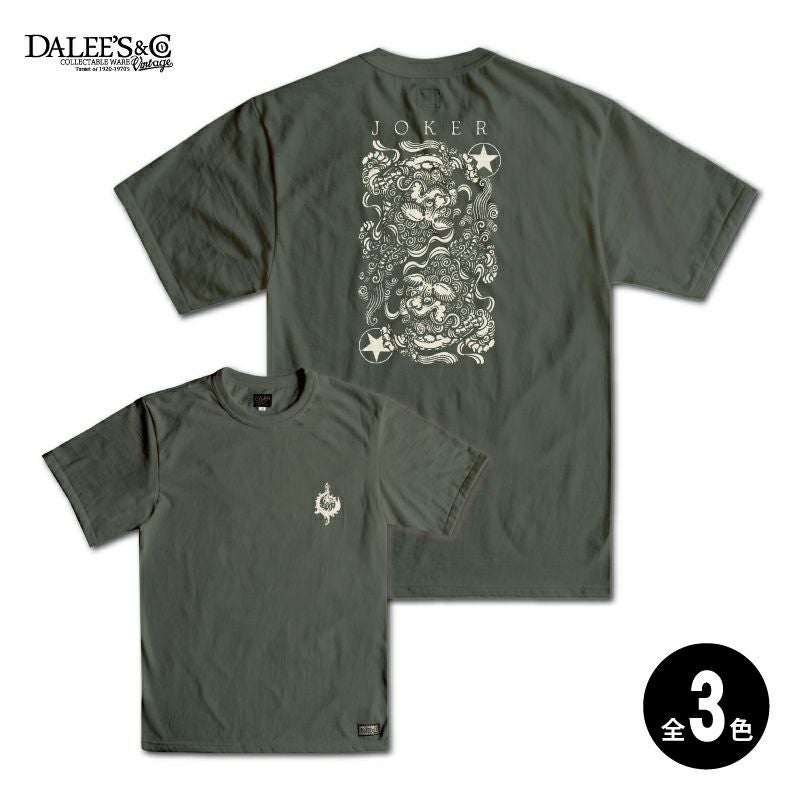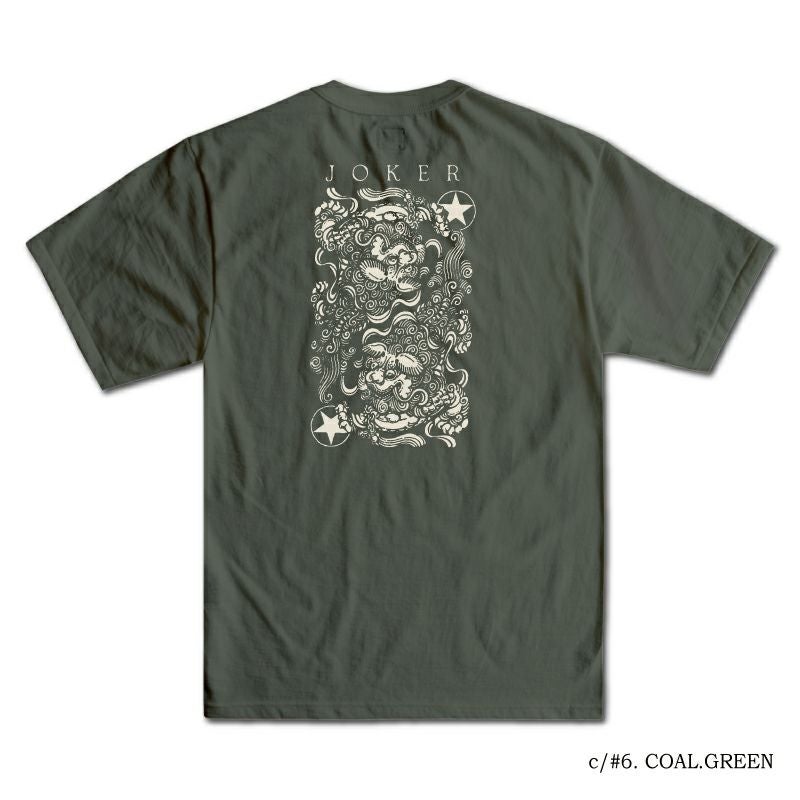 和歌山の旧式吊編機により、ゆっくり空気を含みながら編み上げたオリジナルの丸胴生地。凸凹のムラ糸表面をガスバーナーで焼き、毛羽を焼却したガス焼きスラブ糸から編み上げた天竺素材は、至高の着心地とサラリとした手触りそして横に走る凹凸感が雰囲気抜群のTシャツです。デザインは、狂騒の1920年代のJOKER柄。