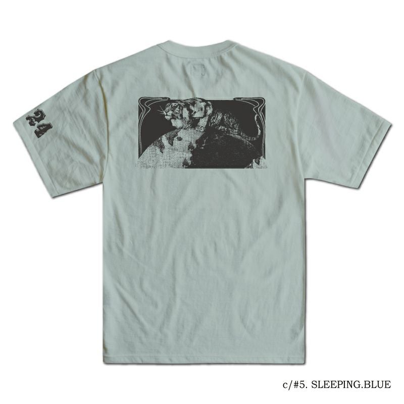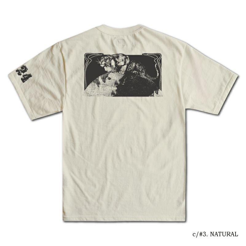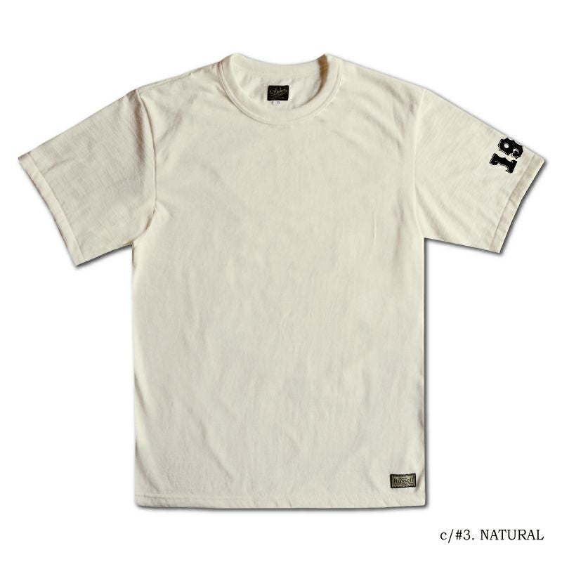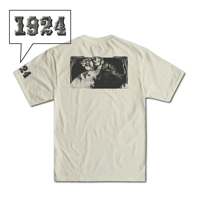 和歌山の旧式吊編機により、ゆっくり空気を含みながら編み上げたオリジナルの丸胴生地。凸凹のムラ糸表面をガスバーナーで焼き、毛羽を焼却したガス焼きスラブ糸から編み上げた天竺素材は、至高の着心地とサラリとした手触りそして横に走る凹凸感が雰囲気抜群のTシャツです。デザインは、狂騒の1920年代の1924柄。