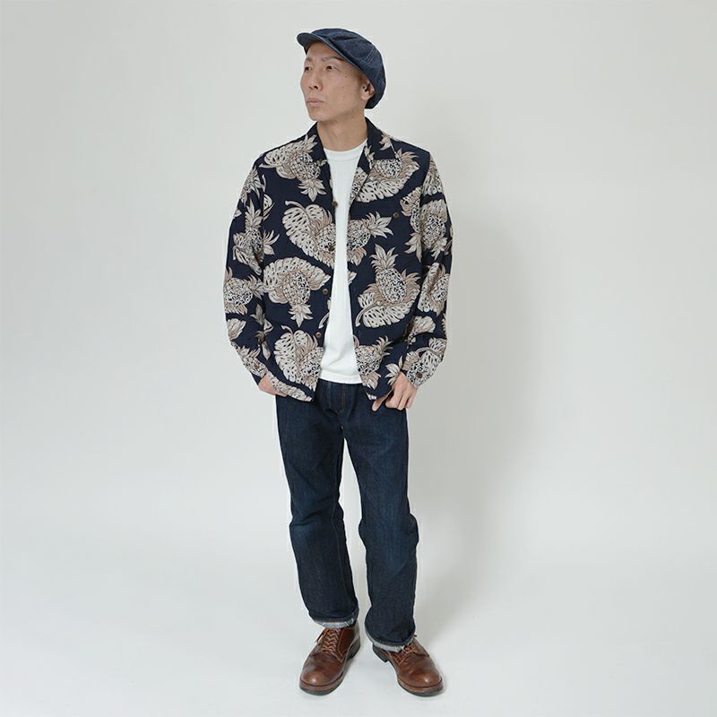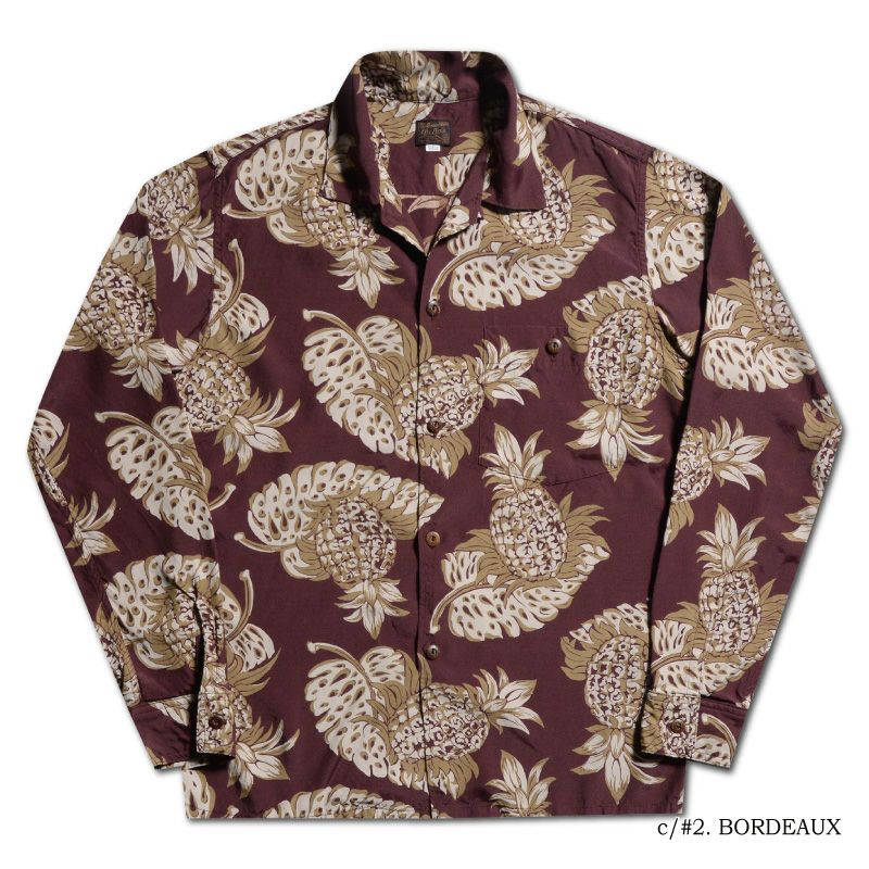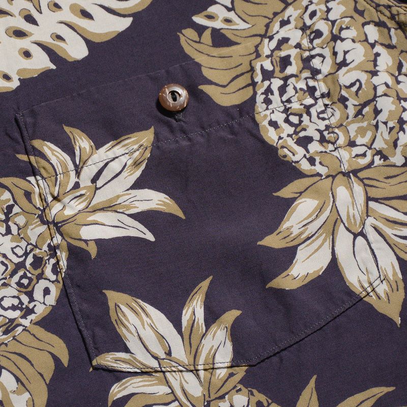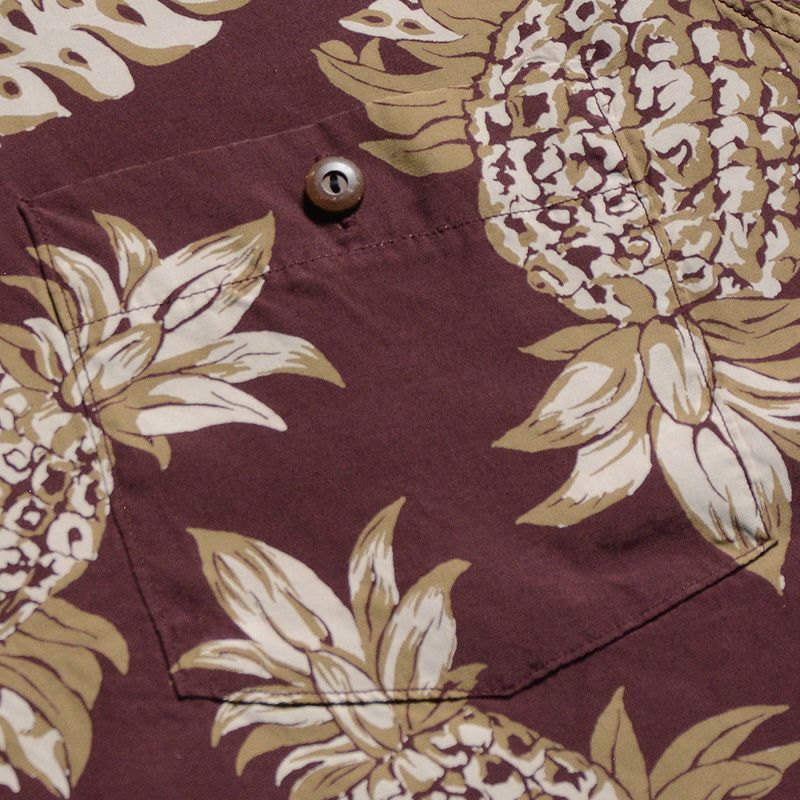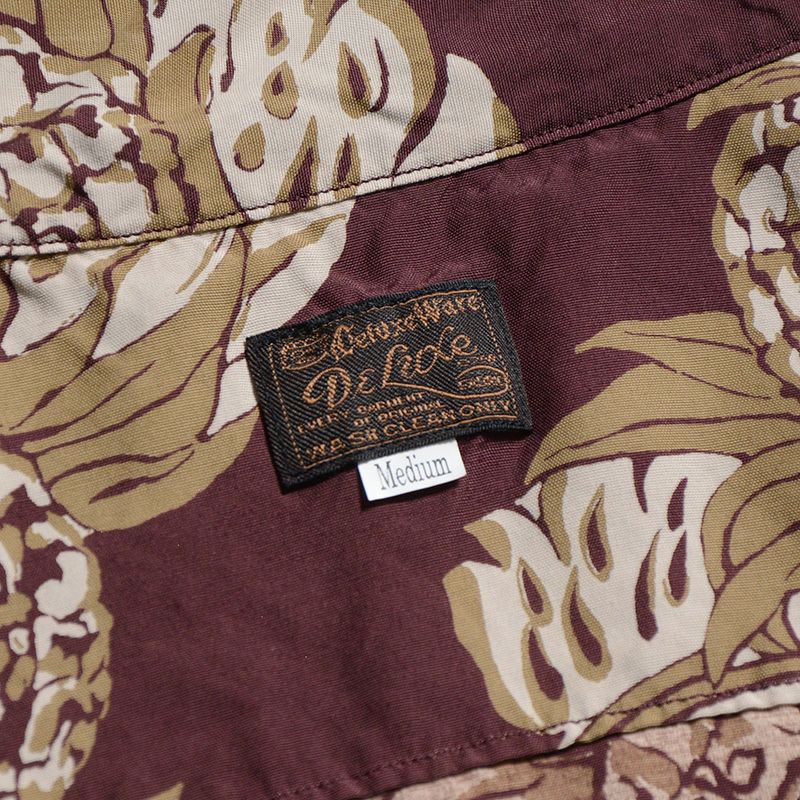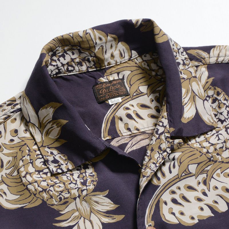 1950年ヴィンテージアロハシャツに実在した柄をリデザインしたパインリーフ柄。当時のリゾートブームを受けてサンフランシスコからハワイまでの船での航路「マトソンライン」が活発になったことで南国を想わせるデザインが広がった。この風潮を反映するかのようなパイナップルデザイン柄は数多く存在しています。中でも珍しいパインリーフ柄をデラックスウエアがリデザインしたことでスッキリとまとまったイメージに仕上げました。また、当時を彷彿とする100%レーヨンによるフジエット素材は、縦糸にフィラメントレーヨン、横糸にスフレーヨンを打ち込み製造しています。このファブリックの素材感と、パインリーフデザイン柄、そして地染め抜染と呼ぶ製造手法(生地を染色した後に柄部を脱色し着色、その後蒸して発色させる昔ならではの製造工程)を経てカタチにした本物のアロハシャツです。地染め抜染の工程を忠実に行うかどうかにより、経年変化の表情に大きく影響することは言うまでもありません。現在もこの先も末永く付き合えるアロハシャツを是非御覧下さい。