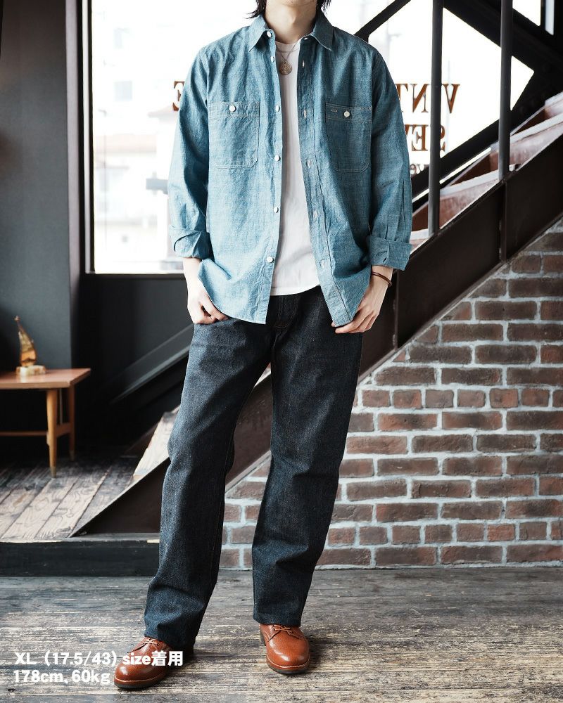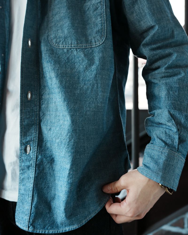 - 経糸アメリカコットン、緯糸にジンバブエコットンを打込み製造した7ozシャンブレー。56本もの高密度組織が雰囲気を創る。