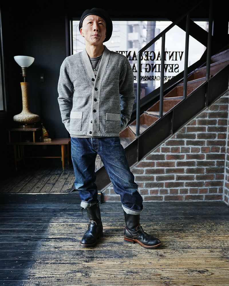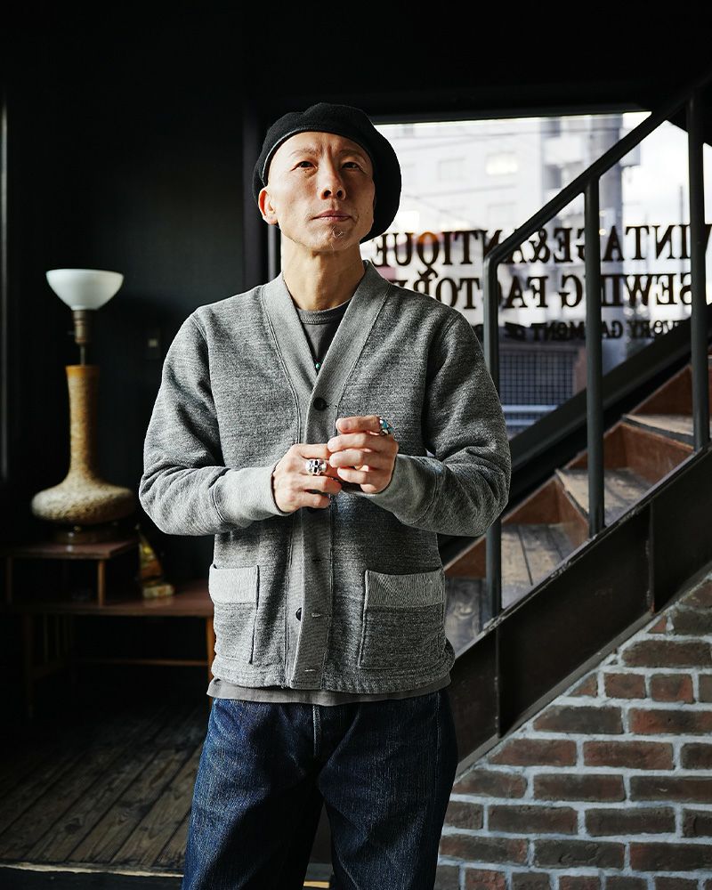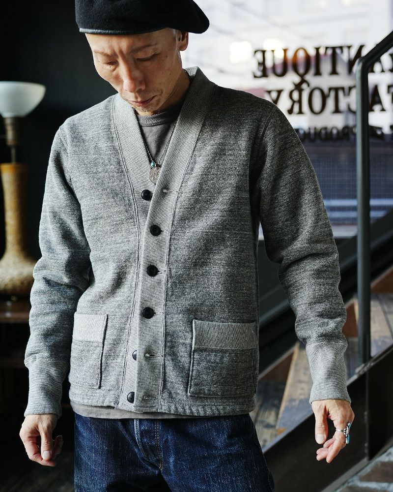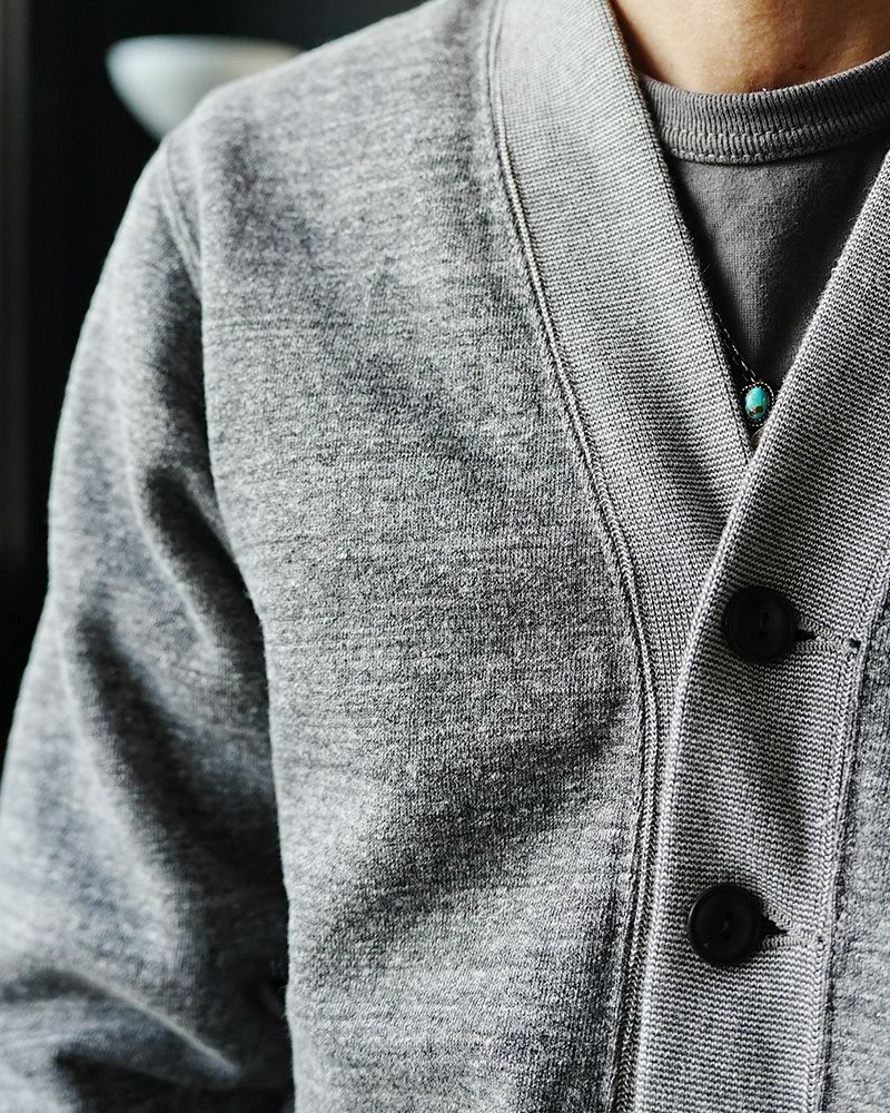 1950s~60sにかけて稀に見かけるスウェットカーディガン。このソルトアンドペッパーと呼ばれる杢グレーは特に希少なヴィンテージとして認知されています。生地が引っ張られ、カタチが崩れ、クタクタな質感が当たり前として見て来たカーディガン、これを今の技術と品質、そして素材で創ると印象が変わりました。時間的な価値を持つヴィンテージ品と現代品質のカーディガンを見比べてみるのも面白い。