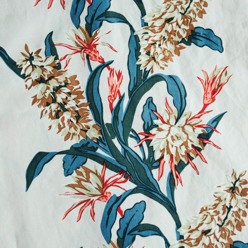 表現に語弊が出ますが「本物のハワイアン」素材を手がけました。国内唯一の福井県福井市のレーヨンシャトル機によるファブリック、さらに栃木の職人手捺染プリントの技法及び染色。使い込むほどにドレープ感が生まれる張りとコシがある初期素材状態。現在国内で製造できる唯一無二のレーヨンファブリックです。