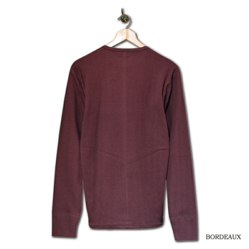 生地にはオリジナルで製造した変形ピケニットを使用。各所に施した3本針カバーリングの中でも逆巻き裾形状が、着用時の引っ掛かりを軽減するほか創りのアクセントにもなっています。細めのバインダーネックの首元は様々なコーディネートにクセなくお使いいただけます。