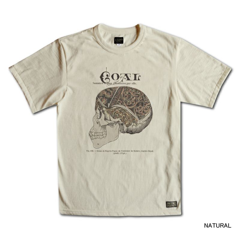 和歌山の旧式吊織機により、ゆっくり空気を含みながら編み上げたオリジナルの丸胴生地。凸凹のムラ糸表面をガスバーナーで焼き、毛羽を焼却したしたガス焼きスラブ天竺素材です。至高の着心地とサラリとした手触りそして横に走る凹凸感が雰囲気抜群のTシャツ。プリントは1900年代をイメージした炭鉱スカル柄。