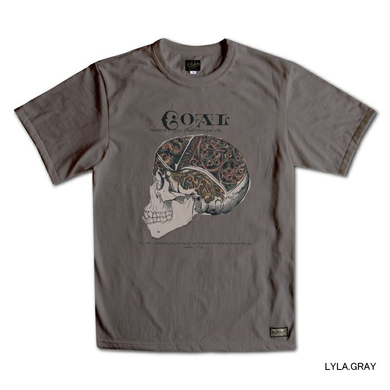 頭品番、サイズ感を同等にしながら素材やデザインが変更されて毎期発売されているダリーズのメインTシャツ。1900年代初頭のイメージを感じさせるデザインソースは、1世紀前のタッチや絵画技法そして書体など、現代では歴史に消えたとされる実在のモノがベースです。この時代にTシャツなど存在していないものの、色合い、デザインで表現するTシャツ=カンバスという思考により企画します。デザイン柄に引き込まれ、其々の個性を発揮し、古い時代のアートカンバス素材としてTシャツ以外の価値をも見出して頂けたなら本望です。プリントデザインに採用した炭鉱スカル柄は1900年をイメージした創出デザインモノ。当時の炭鉱業に対する人的被害というダークイメージが時代を感じさせます。