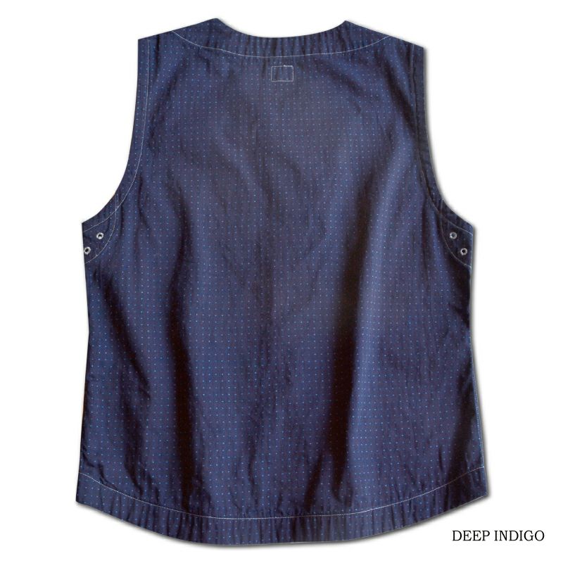 インディゴファブリックに手書き六角形ドットをストライプ状に抜染したウォバッシュ柄が特徴です。6.8オンス程度のシャンブレー素材として軽くて丈夫なうえ、インディゴ特有の経年変化も楽しめるオリジナル素材です。