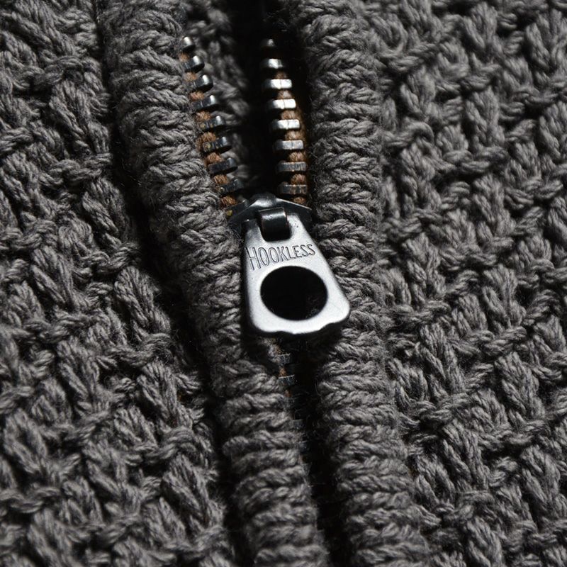 17番綿糸を6本撚り合わせ、横編み機で身頃、袖とパーツで製造するセーター素材です。パーツで編み製造し、リンキングで袖リブ、腰リブを編み合せ、首元のリブとファスナーは縫製により製造する創り込みが特徴。