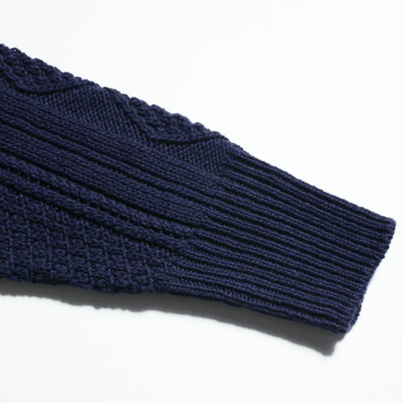 基はヨーロッパ北欧の漁師たちが着ていた手編みの未脱脂ウールセーター。漁に出る男達のため女性達によって手編みされ、家々で異なる柄だったことから漁における不慮の事故の際も身元を判別出来たとも謂れがあります。羊の油を脱脂せずそのまま手編みしたため雨風を防ぐ役割を備えたズッシリとした重量のセーターでした。