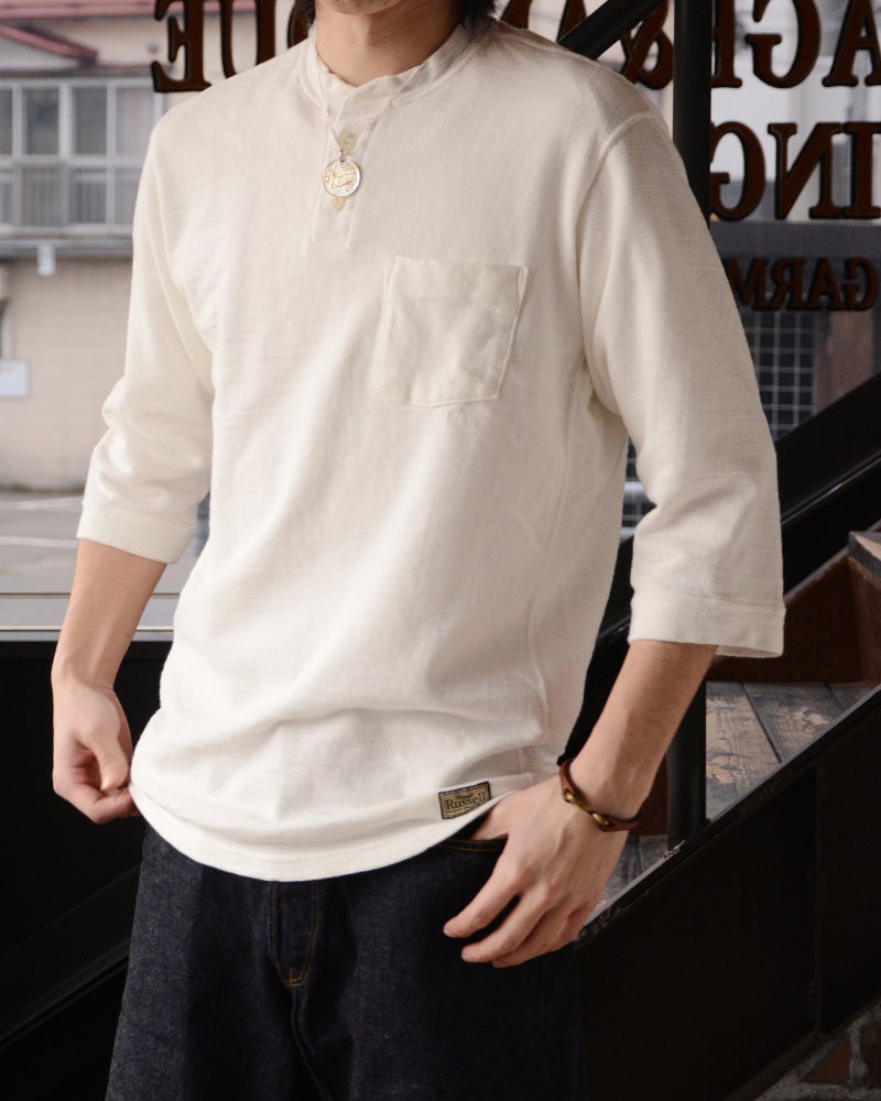 様々な形状を生み出すハニカム編機を駆使して製造した「特殊ピケニット」。コットン100%も柔らかい着心地と、生地裏の凹凸によって吸汗しつつも肌への張り付きがなく気持ちよく着用出来ます。また、6分袖とヘンリーネックの組み合わせにより一枚着や重ね着などファッション幅を広げるアイテムとしてもおすすめです。