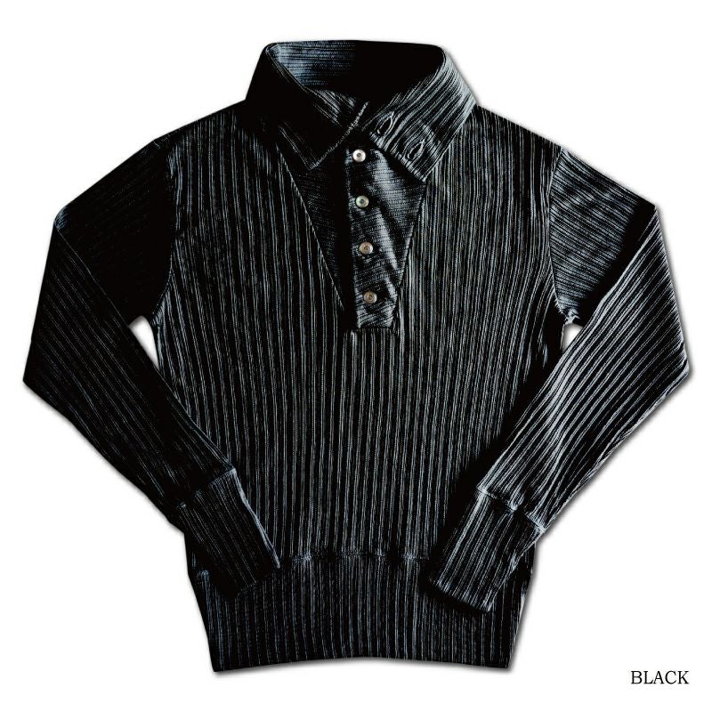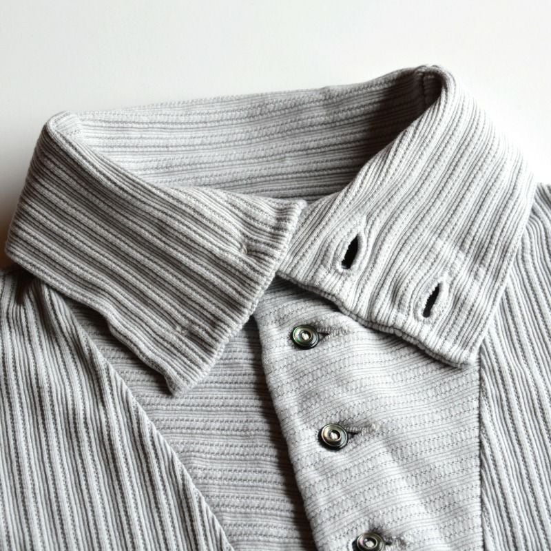 本来のリブ編みを変形させデザインニット形状を創り上げた変形テレコ素材。凸凹した見た目とレース編みのようなストライプ、横の伸縮がありストレスなく着用出来ます。また、個性的なエリ元はタートルネックになる変わった仕様です。一枚着やインナーとして様々な要素で合わせてみてください。