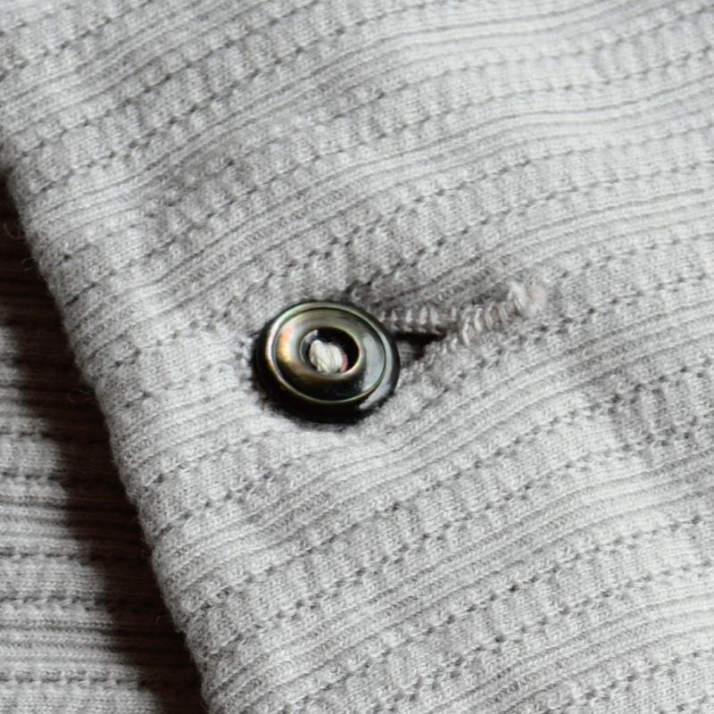 和歌山県和歌山で編み立てた変形リブ編みテレコ。このテレコは針抜きを駆使し、コットン100%はもちろんのことリブ編み特有の横伸縮を保持しながら40番手を2本引き揃えデザイン編みした変わったテレコです。凸凹する生地表情と横の伸縮であることでサーマル地のような着心地が魅力です。