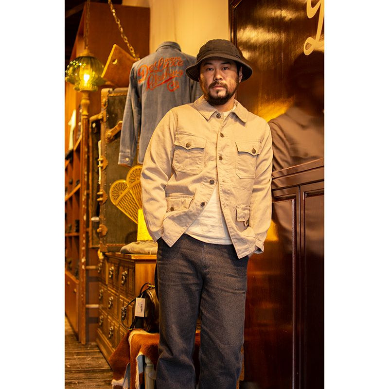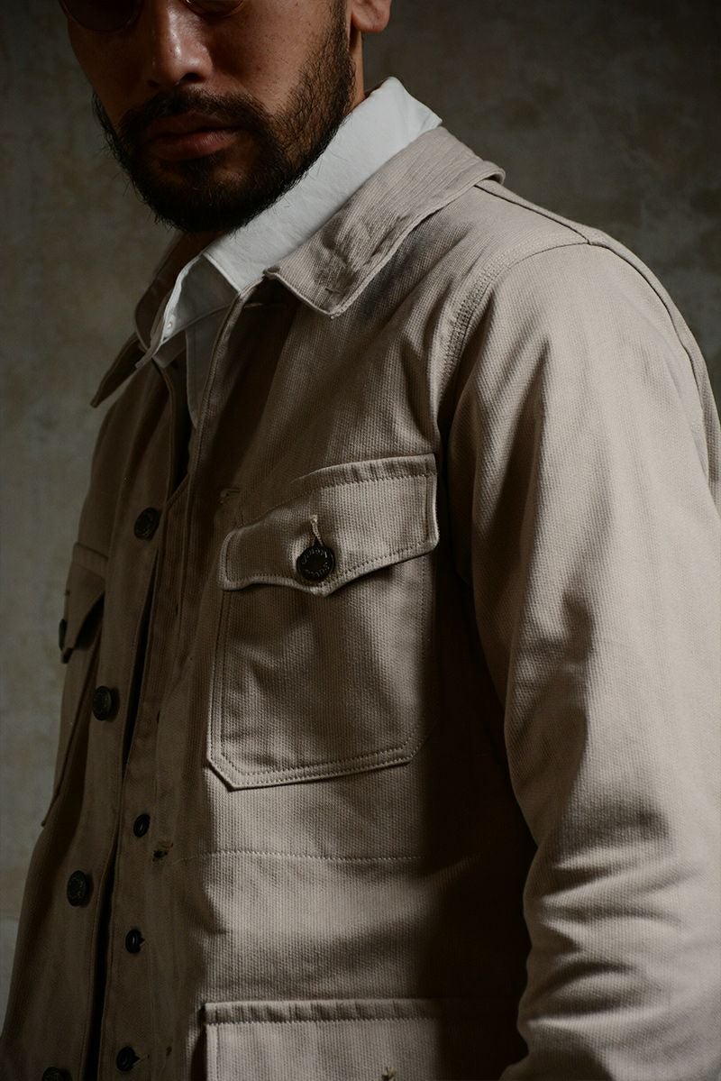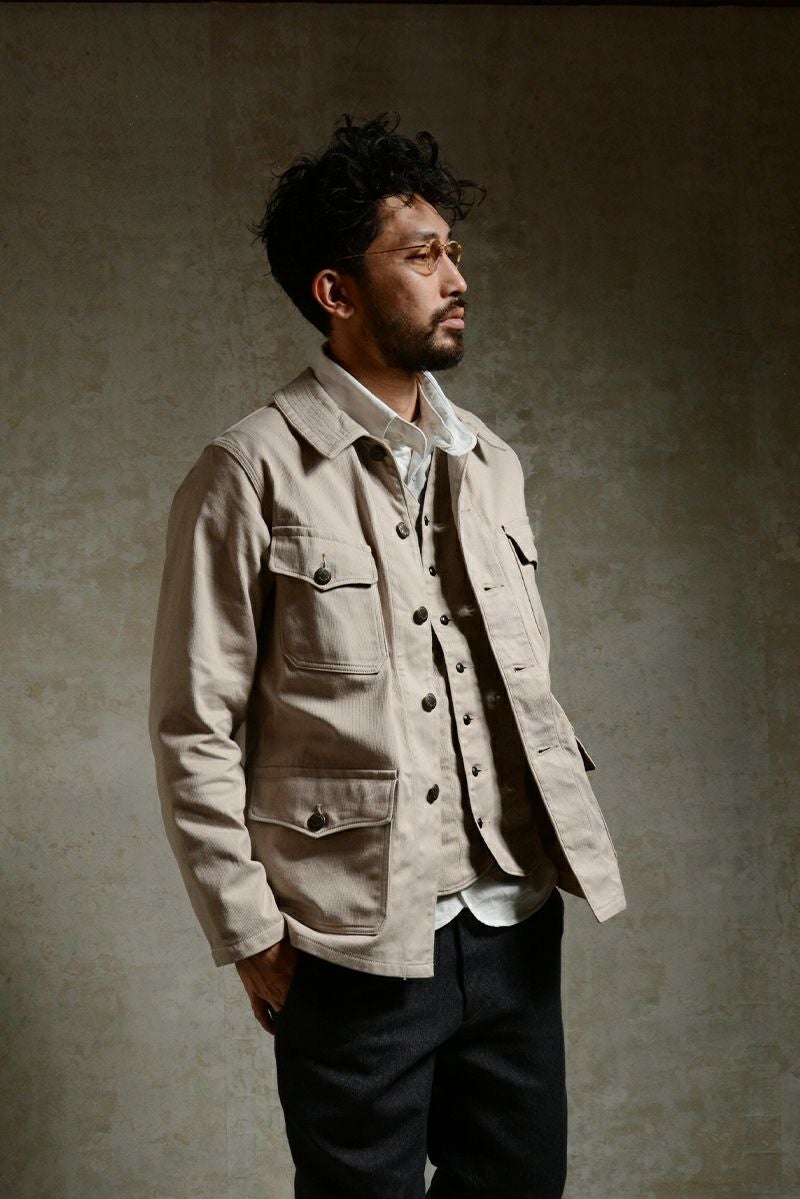 兵庫県西脇で製造したピケ素材を使用したジャケット「ノバック」。1910sフレンチハンティングジャケットを基にスタイリッシュにリプロダクトしたドレス&ワークジャケット。芸術的な新素材「スワローピケ」や独特のカタチなど、アンティークテイスト溢れる1着。