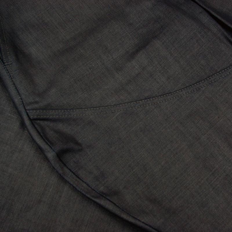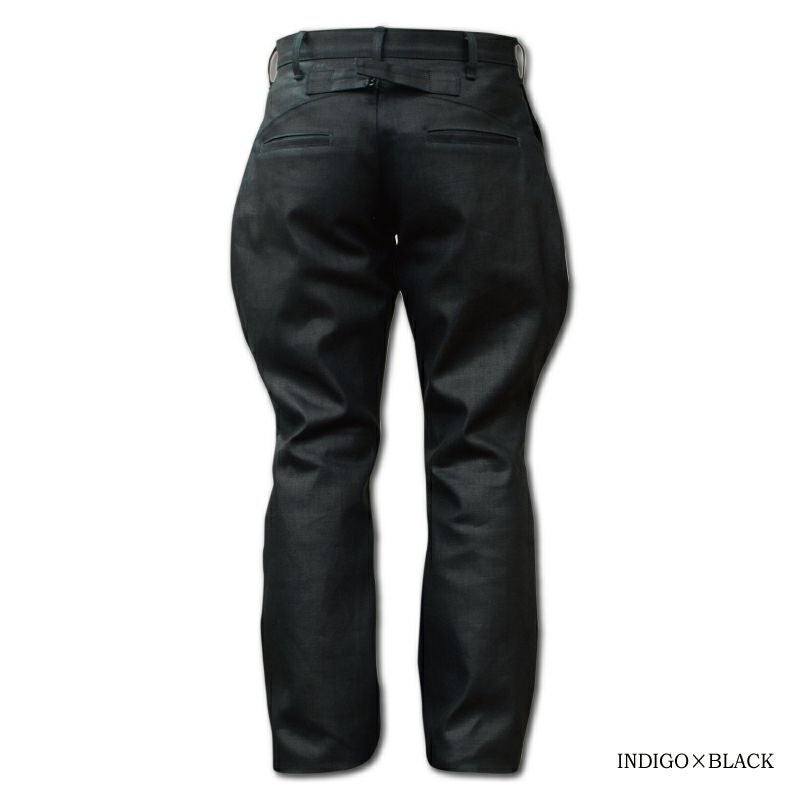 岡山にて旧式力織機で織り上げられた14ozのオリジナルデニムを使用しデニムに顔料施した特殊な素材。防水・遮風を考慮した顔料コーティングとなり、着用、洗いにより下地のインディゴデニムが現れ、デニム特有のエイジングも楽しめます。シルエットはワタリ部分に丸みと膨らみがあるクラシカルな時代のモーターサイクルトラウザーをイメージした造り。