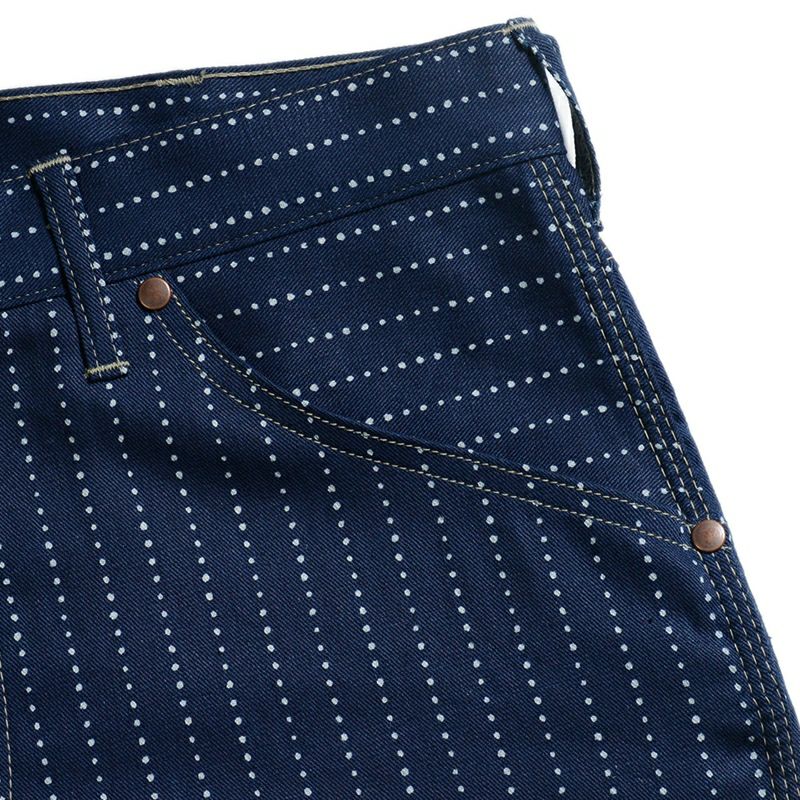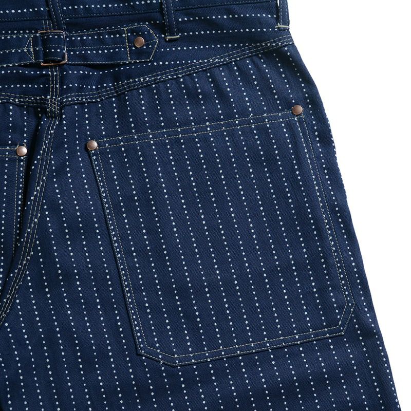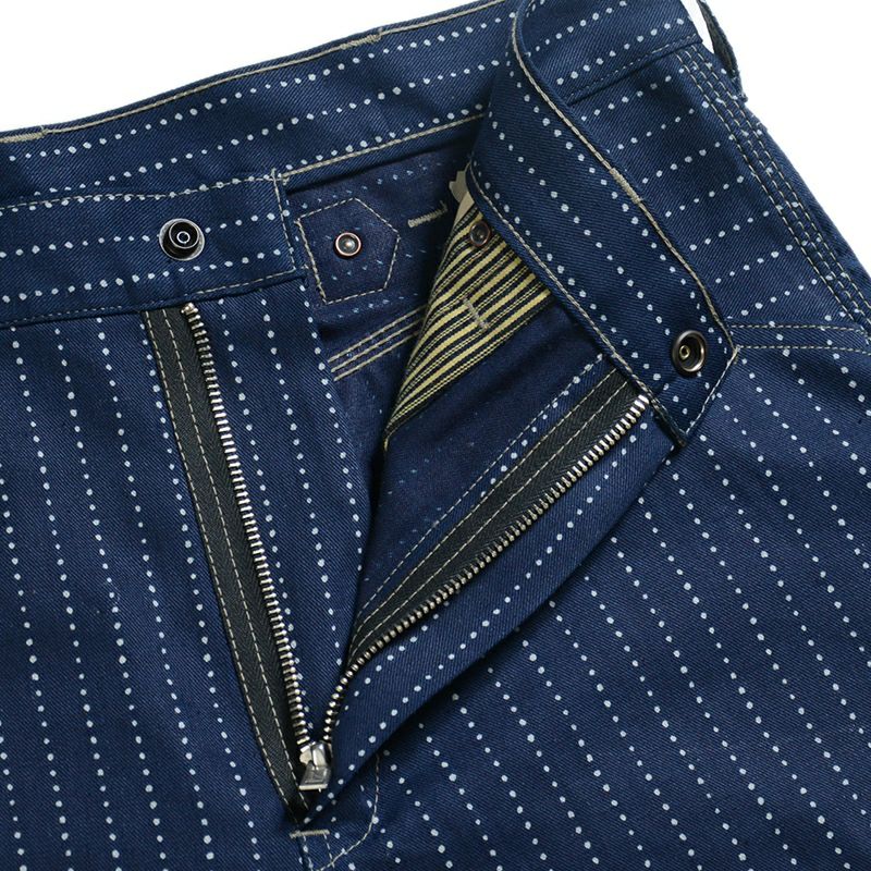 岡山県井原市で旧式シャトル織機によりオリジナル製造した6.8オンスインディゴファブリック。アメリカ綿を経糸に使用し緯糸にはスペイン綿糸を打ち込むことで独特の表情とシャンブレー同等の質感があります。また、手書きにより柄出ししたウォバッシュは広島県福山市で抜染プリントにより仕上げています。インディゴロープ染色による色合いの変化や抜染プリントの質感が経年変化として楽しめます。