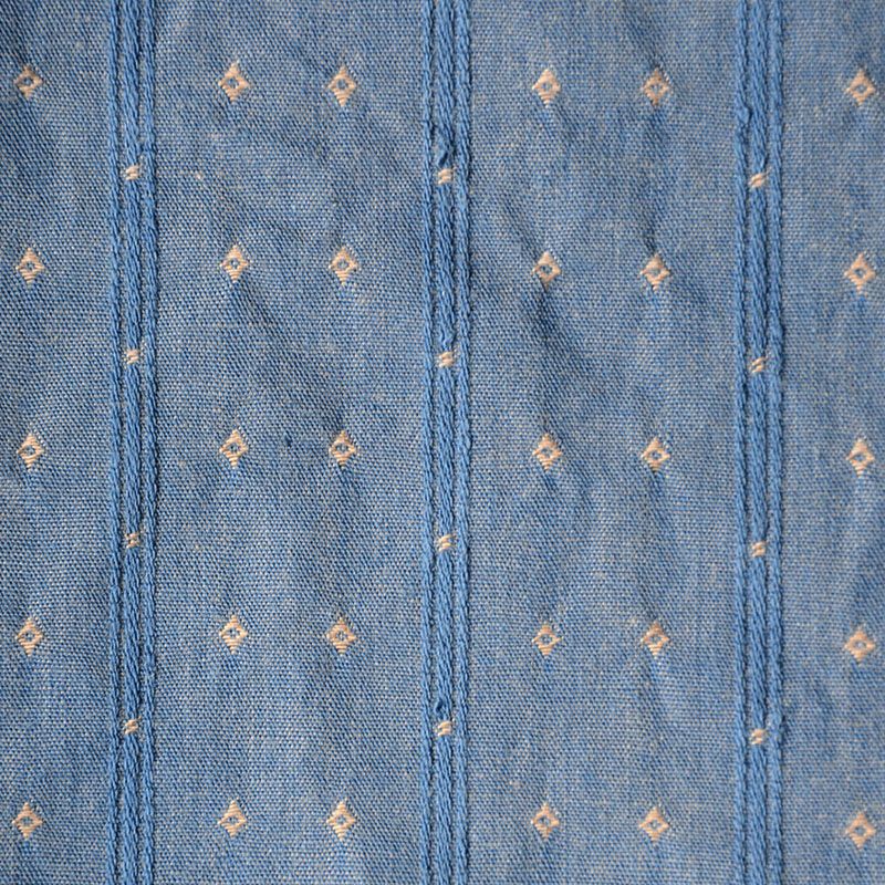 産地兵庫県西脇の旧式シャトル織機による高密度コットン100%素材です。経緯糸共に20番単糸を100本を超える高密度で打ち込むことで製造するこのファブリックは白、インディゴ共に生地に独自の張りとコシ、シャリ感が生まれます。また、インディゴは色落ちし難い「チーズ染めインディゴ」です。