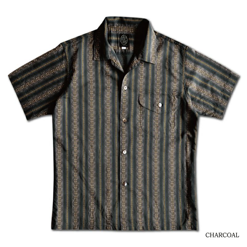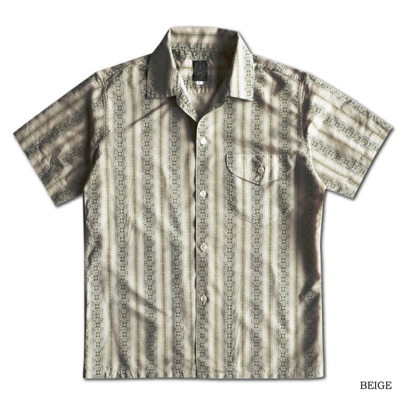 日本唯一の旧式織機から生んだフィラメントレーヨンとコットンによる素材。1930年代の唐草デザインを京都の職人手捺染プリントにて仕上げたオリジナルファブリックです。着込む程にレーヨンのドレープ感が生まれ、素材の経年変化を楽しめる至高のレーヨンシャツ。