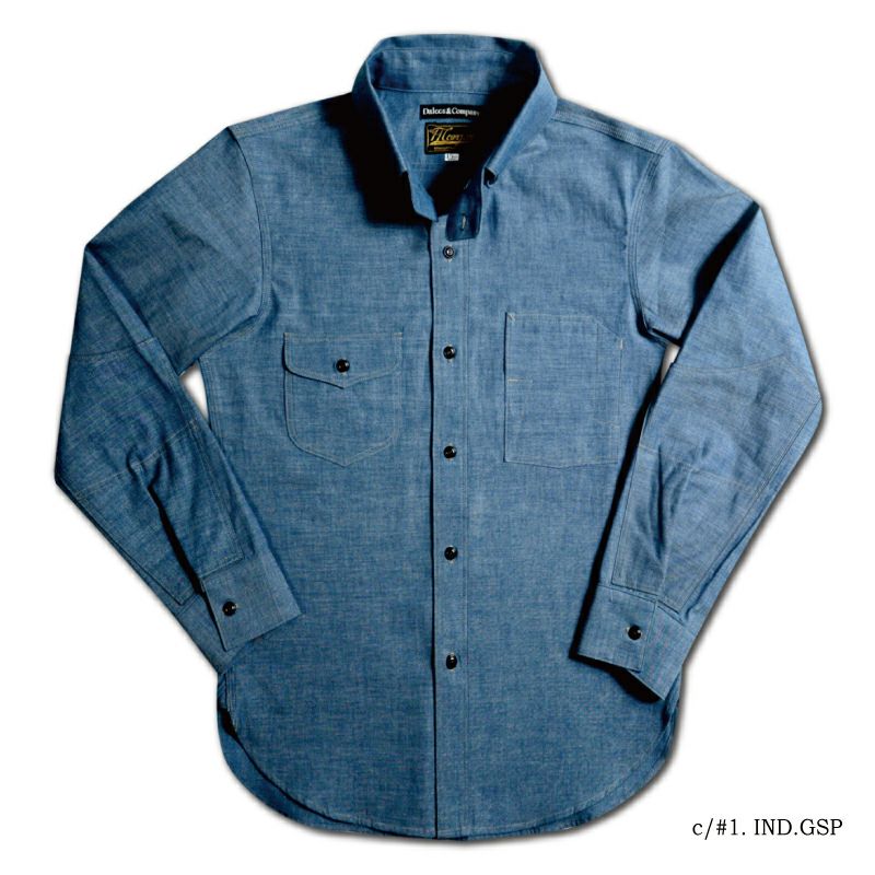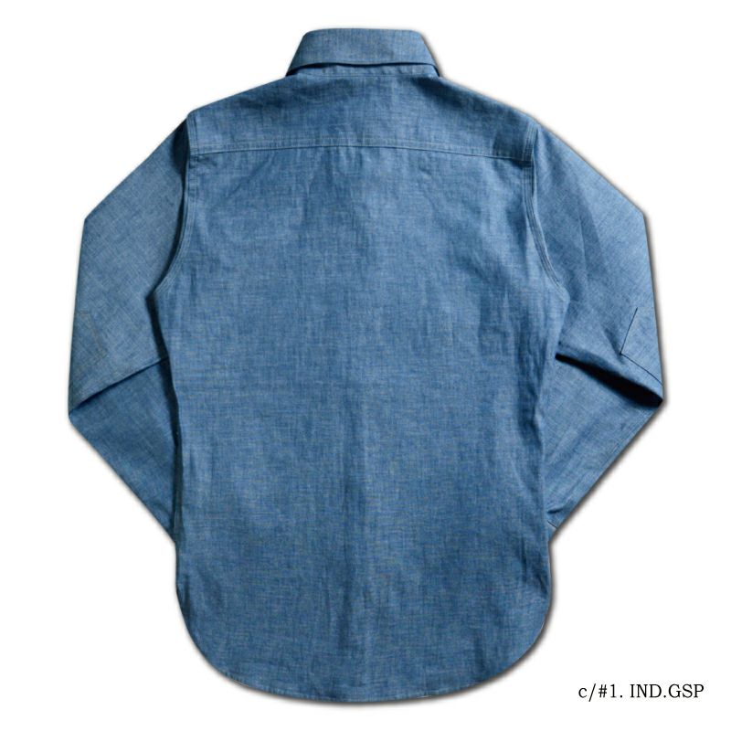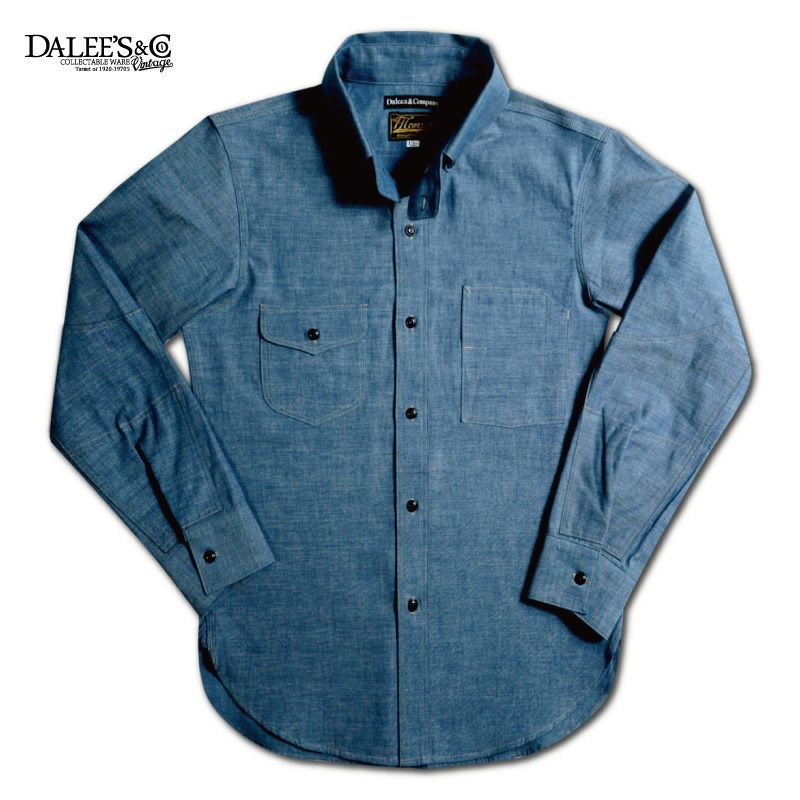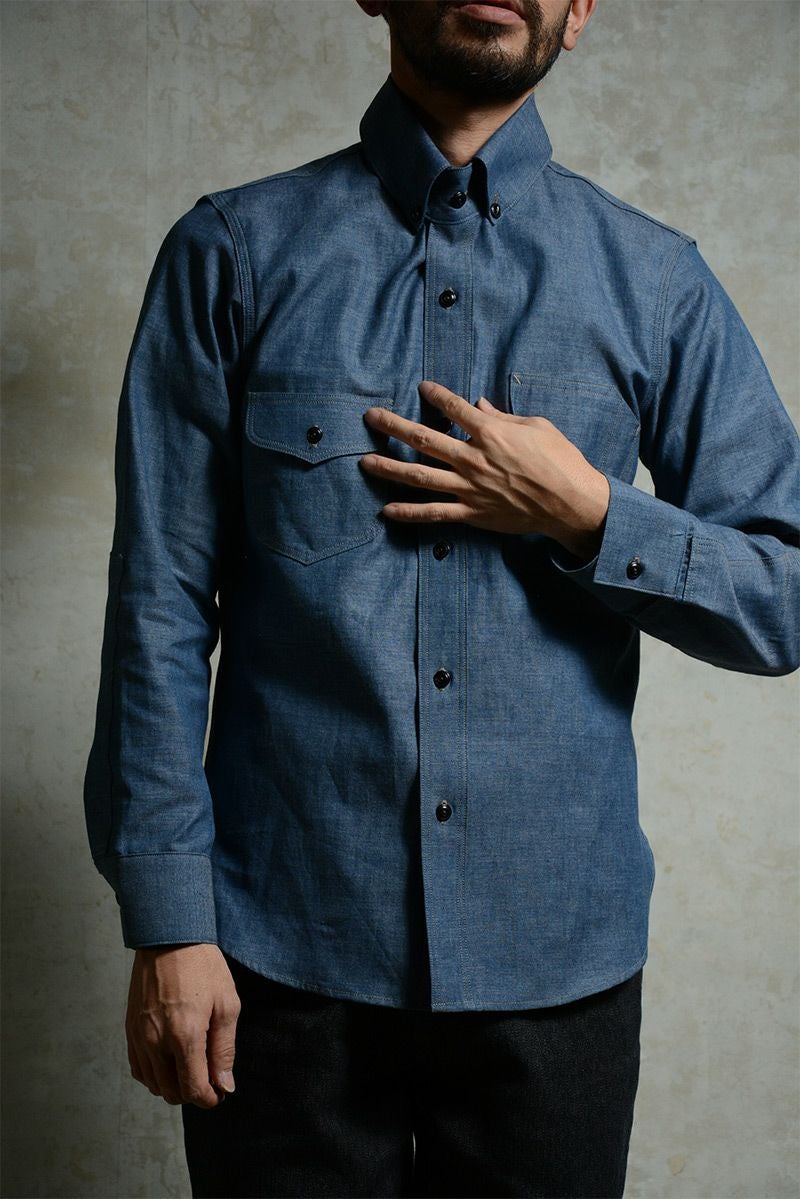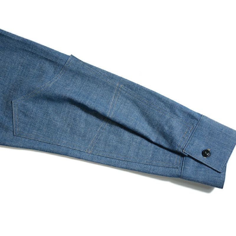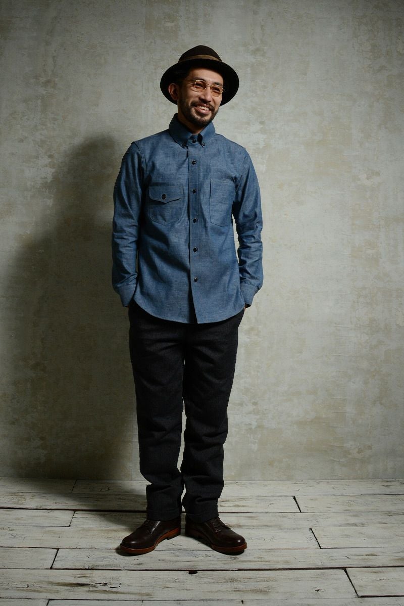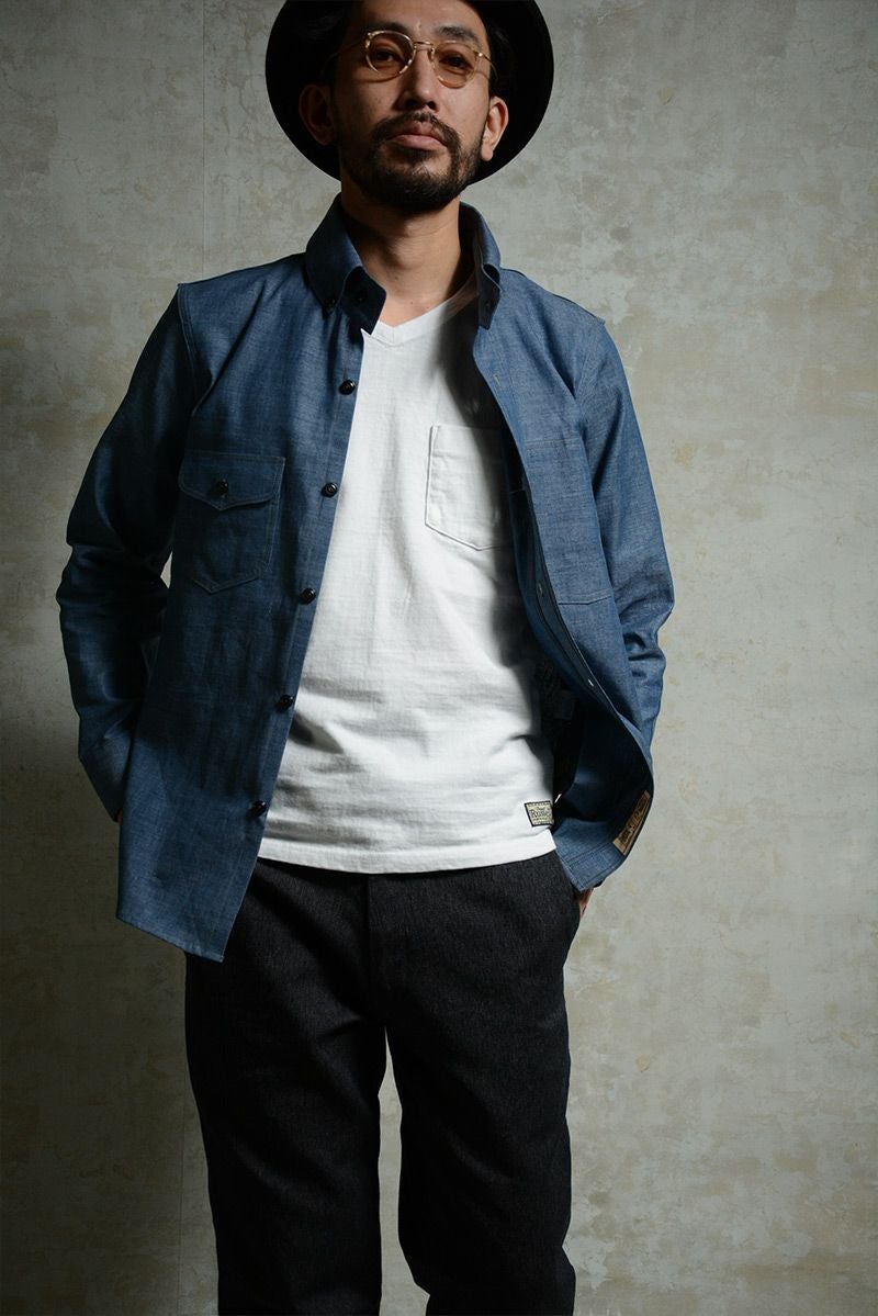 1920年のドレス&ワークにより創造したダブルエルボーシャツ。シャンブレー素材とワークの創りながら、エリの形状やサイズ感など随所にドレス要素を融合した仮想ヴィンテージシャツ。強くスタイリッシュに魅せる色気漂う雰囲気が◎