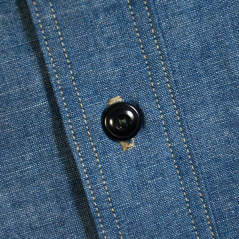この素材は、岡山県井原の旧式織機で製造した6オンスのインディゴシャンブレーを使用しています。経糸にロープ染色織り糸を張り、緯糸にはグレーを染色した織り糸を打ち込み平織で織り上げました。シャンブレーならではの生地厚と強度のバランスを取りながらも、グレー染色した緯糸の色合いによって雰囲気を持った素材に仕上がりました。