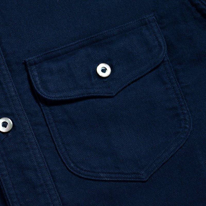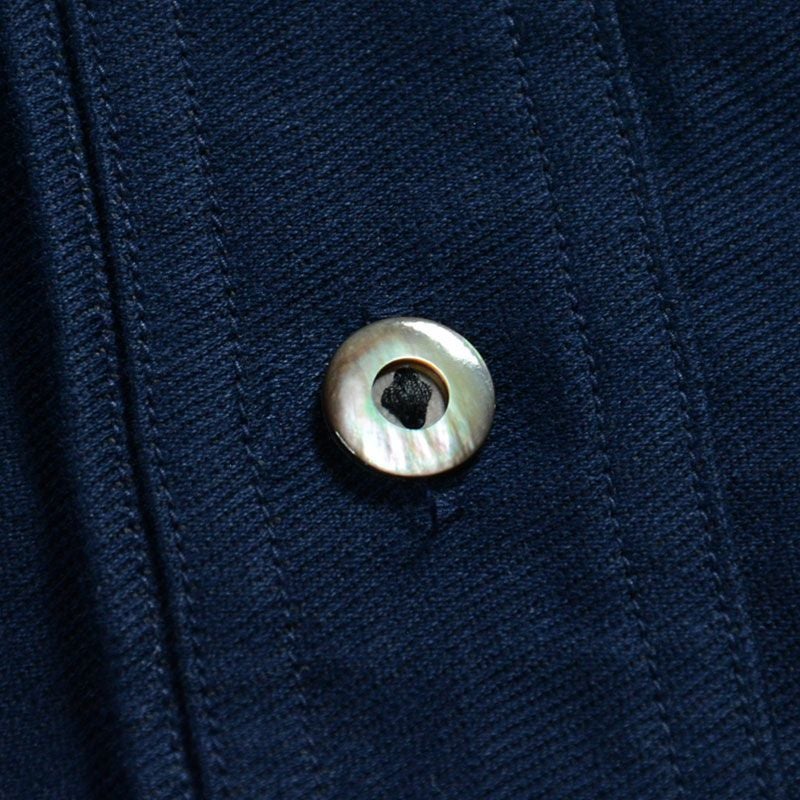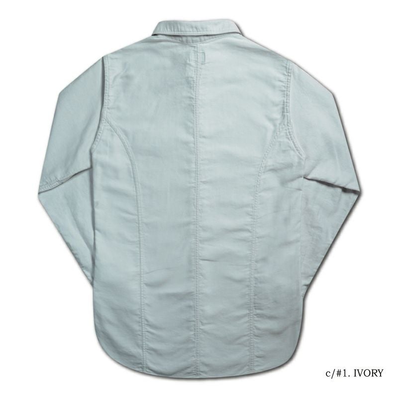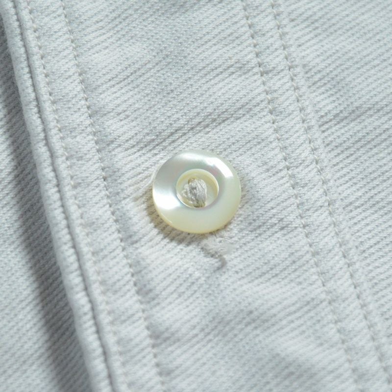 兵庫県西脇市の旧式織機により製造した「ジェルトクロス」。ニ経糸にアメリカメンフィス綿20番単糸を張り、緯糸にコーマ糸40番双糸を打込んだ組織と、経緯異なる織り糸色で染め上げて構成される色合いのほか、右綾織り(サージ)角度を限界低角度まで変形させた組織と表情が特徴です。他にも過去にも類のないオリジナルファブリック。