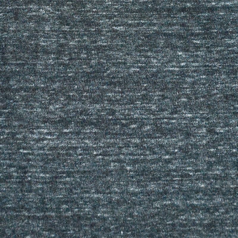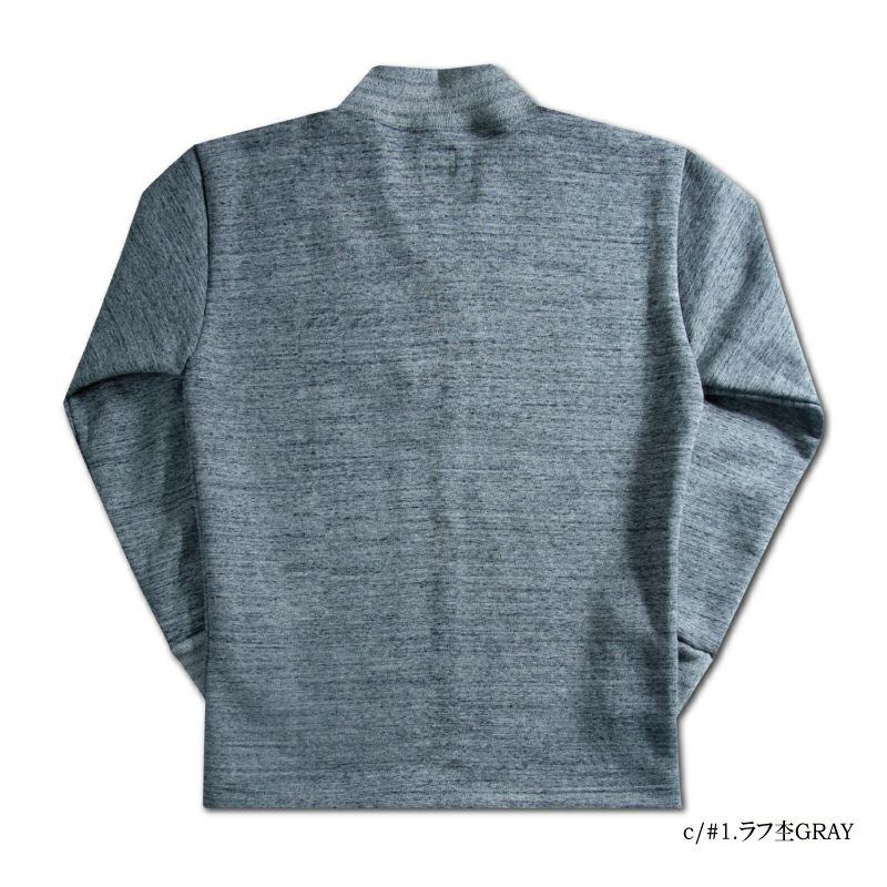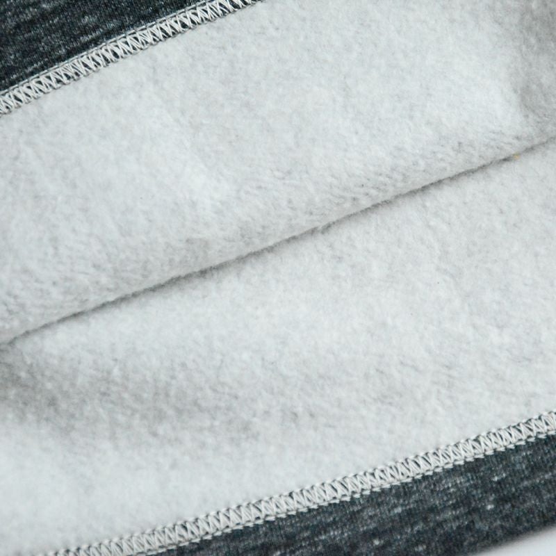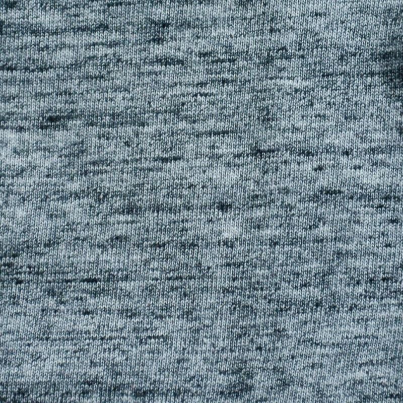 和歌山にて旧式吊編機により製造する吊裏毛素材。本来この旧式編機は「フワフワに柔らかく空気を含むように編み上げる特徴」を持ちますが、デラックスウエア企画では旧式吊編機に手を加え、最高密度で編み上げることでしっかりとしていながら突出した高保温性を得ています。また荒くラフな混紡杢糸を使用することで独特な見た目を創り上げています。