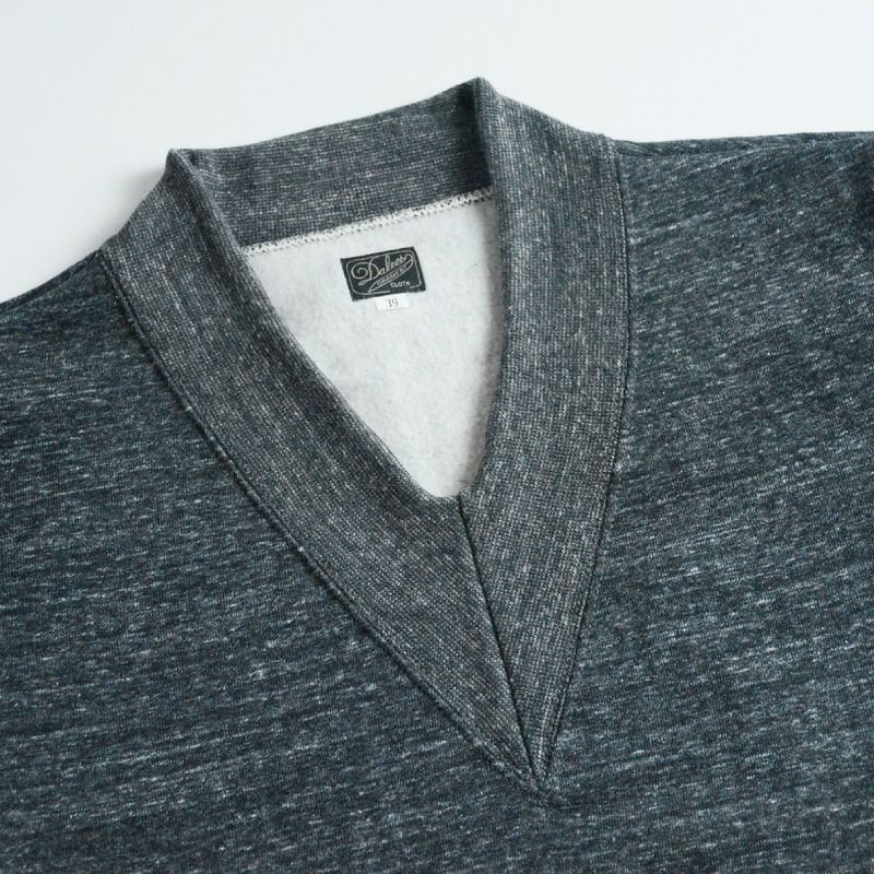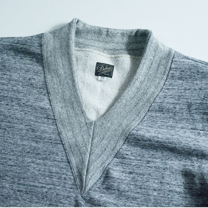 唯一和歌山に存在する旧式吊編機を使用した最高密度のラフ撚杢吊裏毛素材を使用した特殊ニット。1910年フランスアーミーセーターの形状を起源に、バランスを取り直した一種独特のニットです。クルー(丸)ネックとV形状の首ハギがインパクト大!普通の形状に飽きた方は是非お試しあれ。