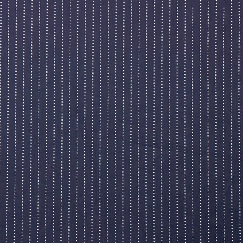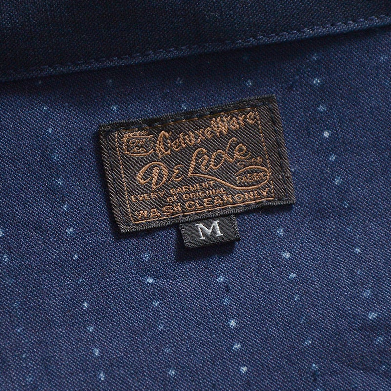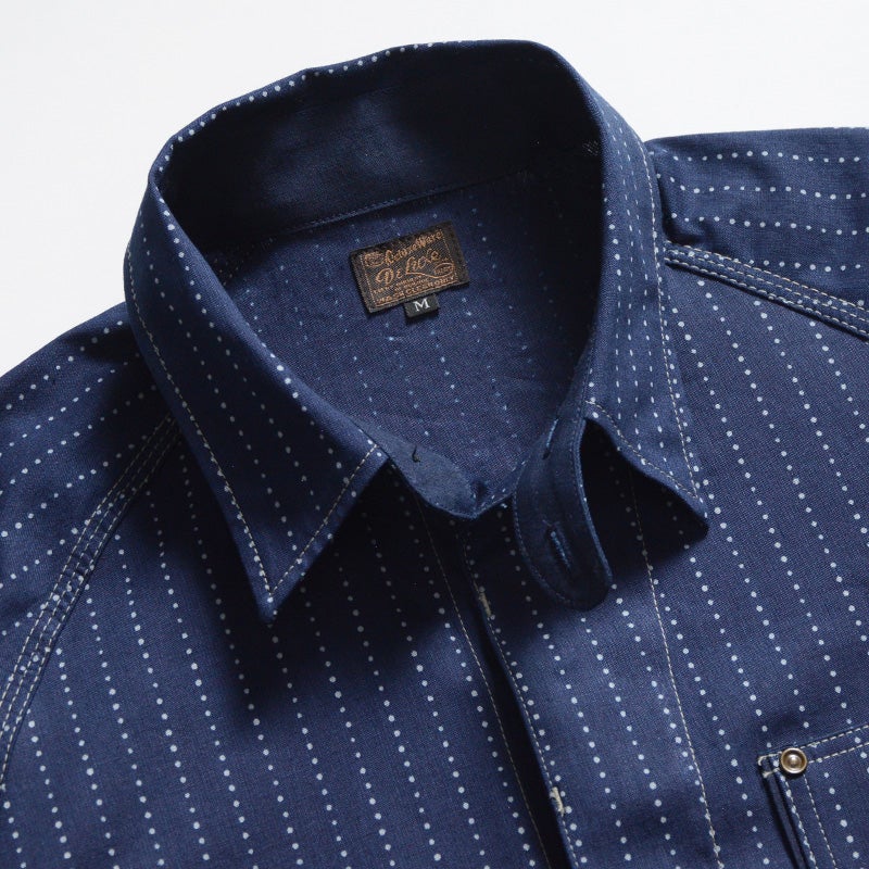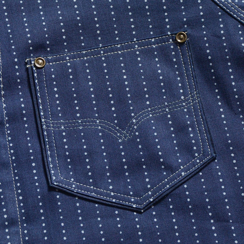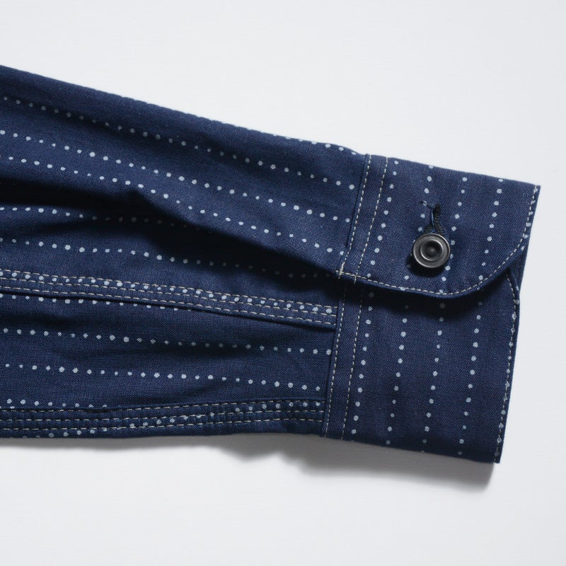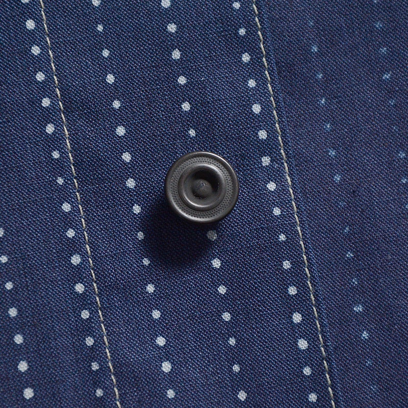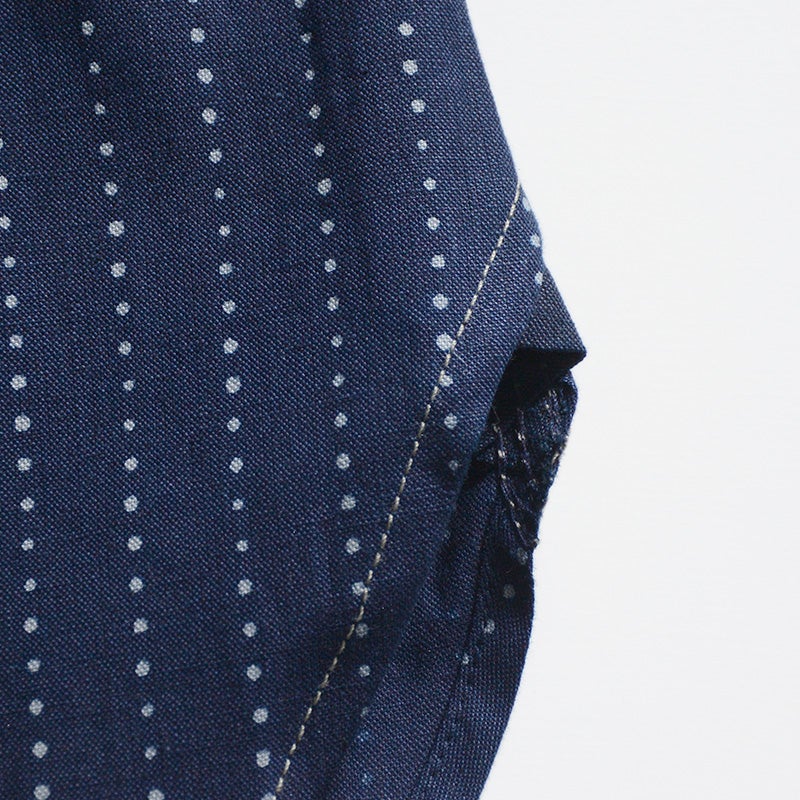 岡山県井原市で製造し広島県福山市でプリントを行ったインディゴウォバッシュ生地。経緯糸共にロープ染色のインディゴ織り糸を使用した素材に、手書き六角形ランダムドットにより着抜プリントを施した本物品質が特徴。