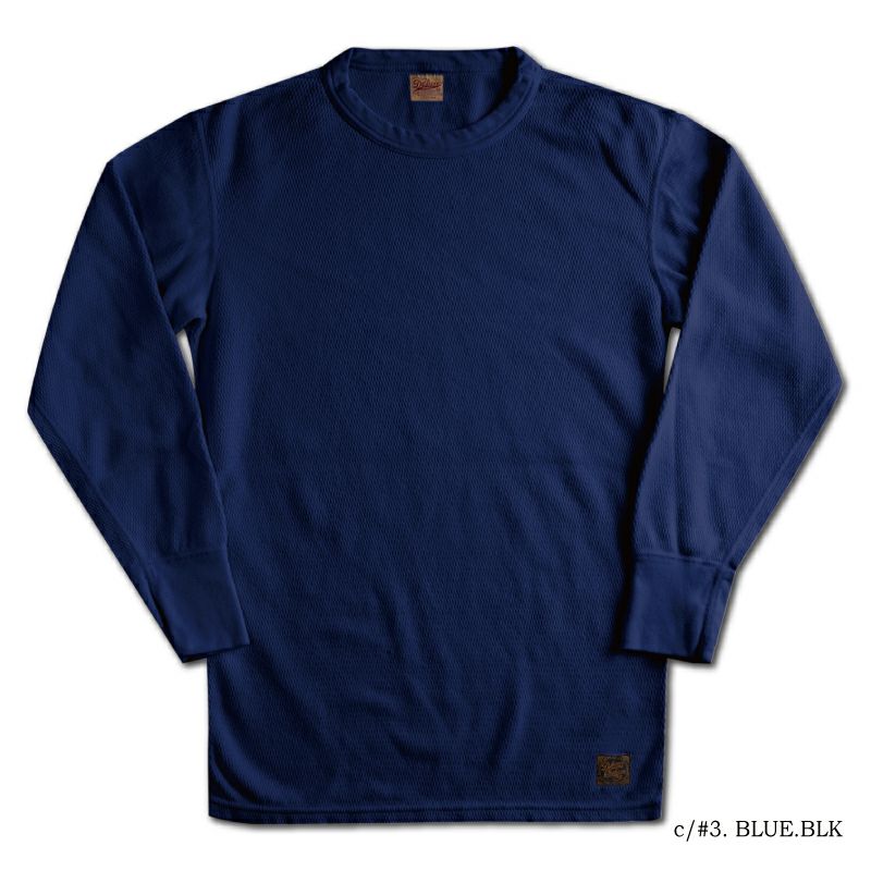 和歌山にて製造する縦目編み片面サーマル素材「ハニカム形状」。1940年にUSネイビーで採用されていた縦目編み形状は、空気の含有率が高いことでも知られその保温力が価値として浸透しています。その縦目編みを度詰め(密度入れ)し、耐久力と保温性を向上させたオリジナル素材。