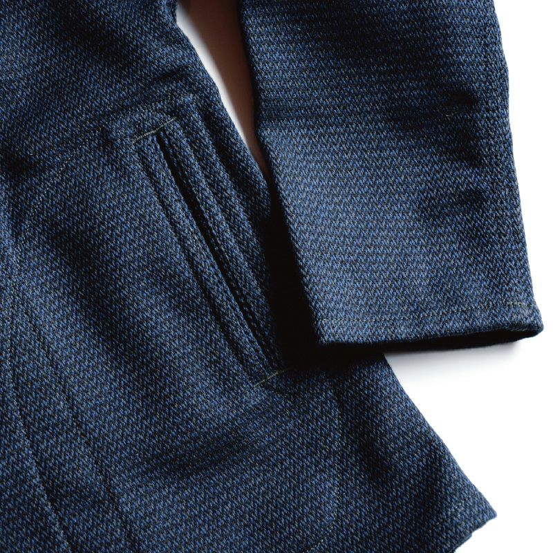 愛知県一宮市にてオリジナル製造した特殊素材を使用。 ニュージーランドとブルガリアのウールとコットンが融合し色が複雑に混ざり合う表情の素材を使用し、一枚仕立てのショートレングスへとバランスを取り直したピーコート。