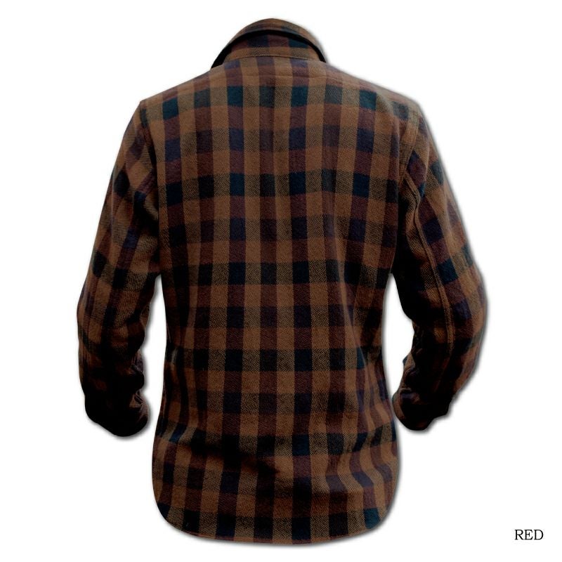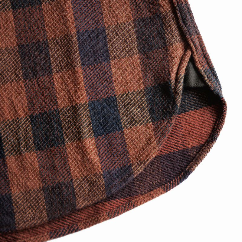 この素材は、産地新潟見附市で製造された特殊生地である。三本引き揃えという組織構造を持ち、弱テンションで織り上げた後に強力に洗い上げることで生地密度を高めた珍しい製造過程により構築される。また、のべ10色以上の直接染料先染め糸による全体の色バランスも見物である。ディテールにはヴィンテージを基にした縫製仕様(糸ピッチ、主要部の二本針巻縫い)やオリジナル製作した椰子の実の削り出しボタン、着心地やスタイルを重視し、古着やヴィンテージの傷むポイントを探りながら一部立体形状のパターンで製作。タイト・ジャストサイズでも心地よい着心地が体感出来る。