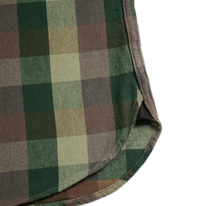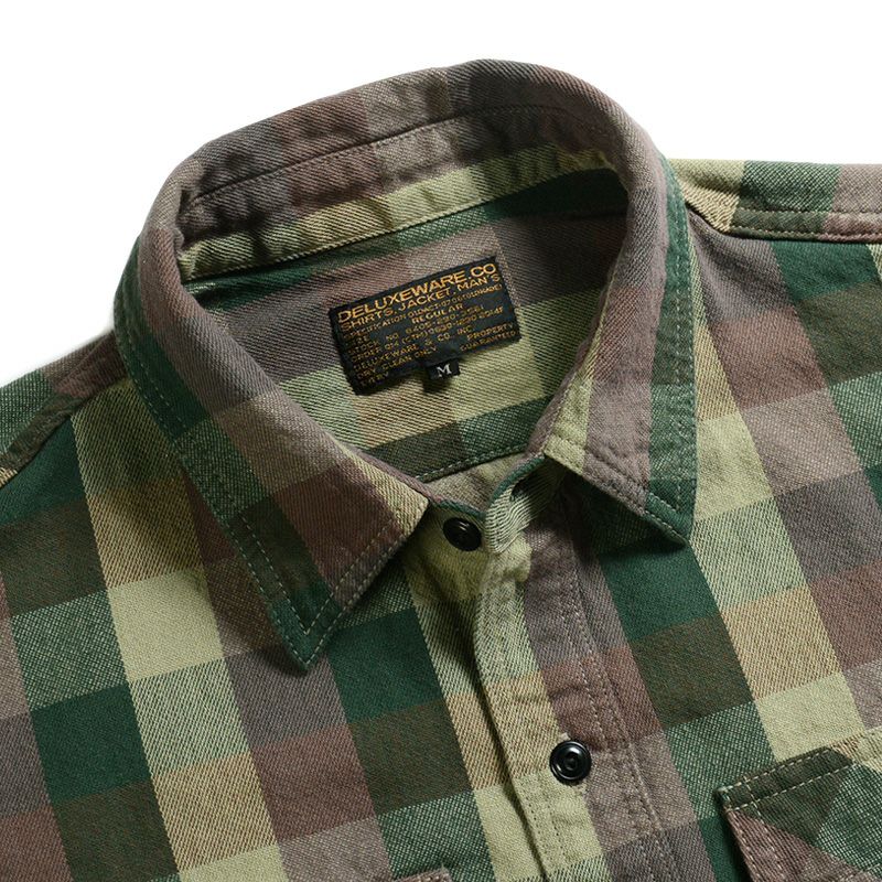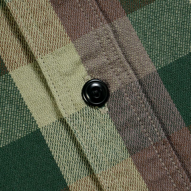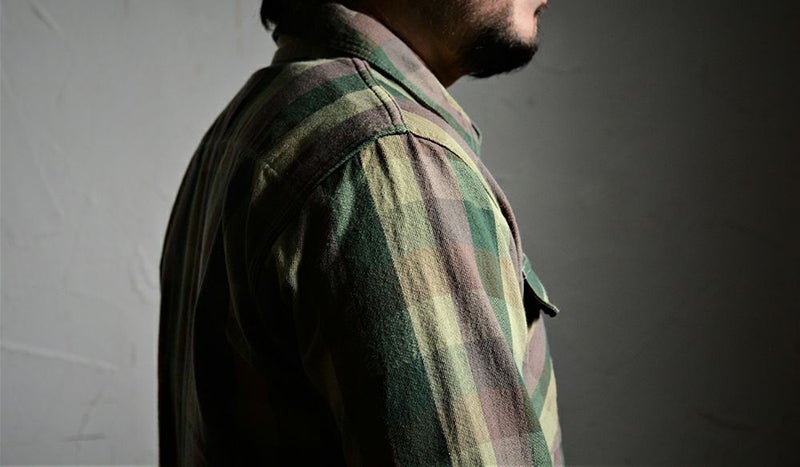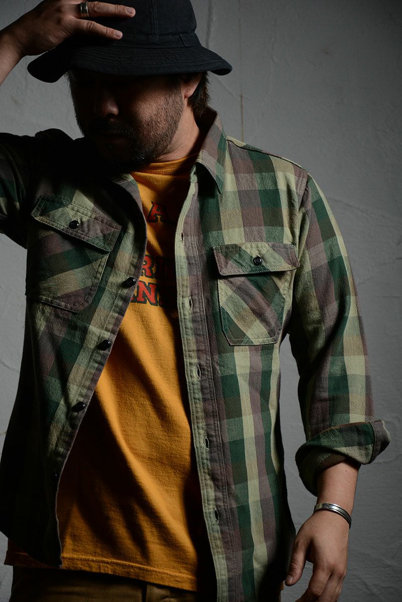 新潟県見附で製造したミディアムネル素材。厚すぎず薄すぎずの素材感は3シーズン対応の幅広い使いやすさが魅力です。カモフラージュ柄をブロックチェックで表現した一風変わったチェックシャツは、ありそうで無かった商品。使い勝手の良さも合わせて一枚は持っておきたいシャツ。