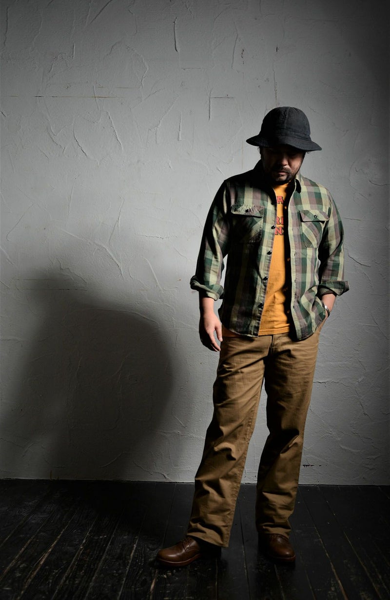 新潟県見附にて企画製造した旧式織機によるファブリック。コットン100%にて2/1綾織りし、その後に裏起毛を施した絶妙な厚さのフランネル素材。経糸に16番単糸を張り、緯糸に8番単糸を打ち込み製造したファブリック。ザラ感が強い手触りと、生地裏の微起毛が着用時の肌触りを向上させています。