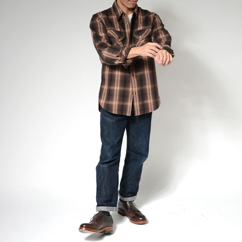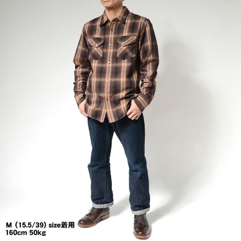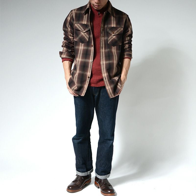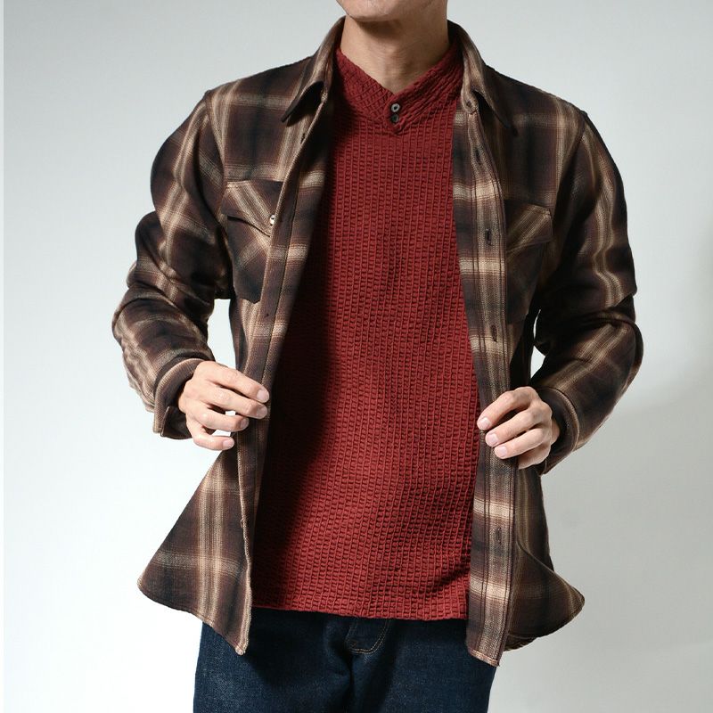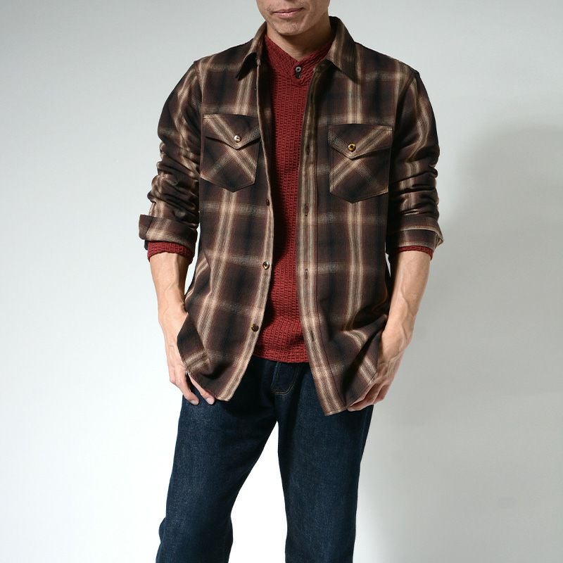 兵庫県西脇で製造したミディアムネル素材。厚すぎず薄すぎずの素材感は3シーズン対応の幅広い使いやすさが魅力です。濃色を用いてオンブレー(ボカシ織り)表現した一風変わったチェックシャツは大人の雰囲気が感じられる商品。使い勝手の良さも合わせて一枚は持っておきたいシャツ。