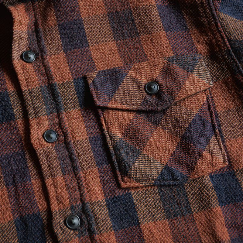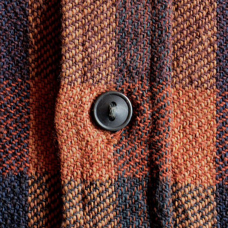 この素材は、産地新潟見附市で製造された特殊生地である。三本引き揃えという組織構造を持ち、弱テンションで織り上げた後に強力に洗い上げることで生地密度を高めた珍しい製造過程により構築される。また、のべ10色以上の直接染料先染め糸による全体の色バランスも見物である。ディテールにはヴィンテージを基にした縫製仕様(糸ピッチ、主要部の二本針巻縫い)やオリジナル製作した椰子の実の削り出しボタン、着心地やスタイルを重視し、古着やヴィンテージの傷むポイントを探りながら一部立体形状のパターンで製作。タイト・ジャストサイズでも心地よい着心地が体感出来る。