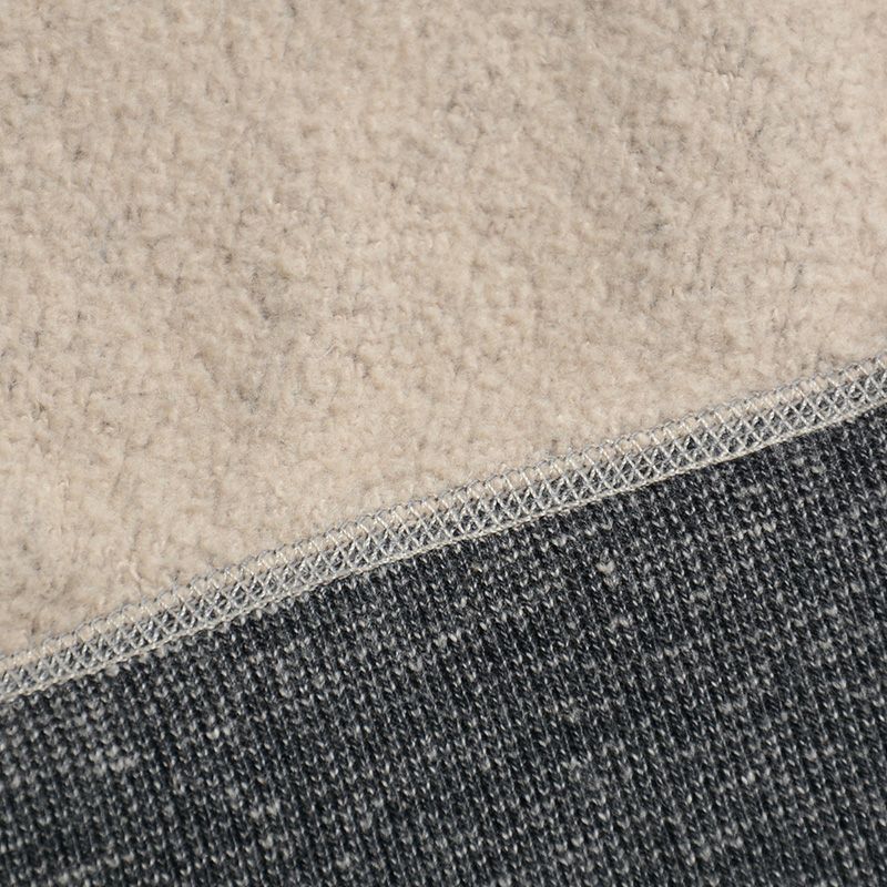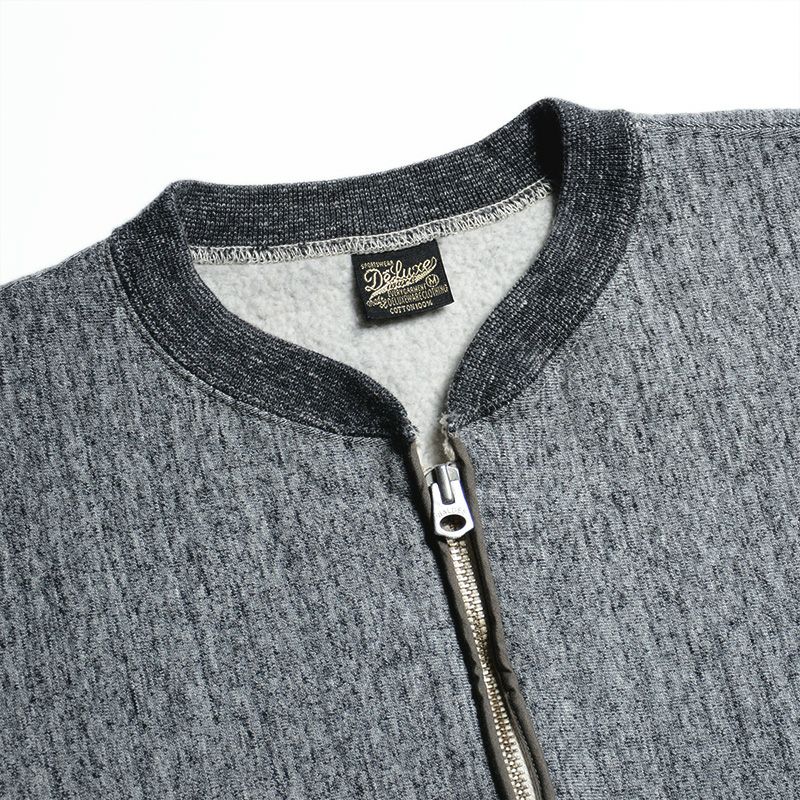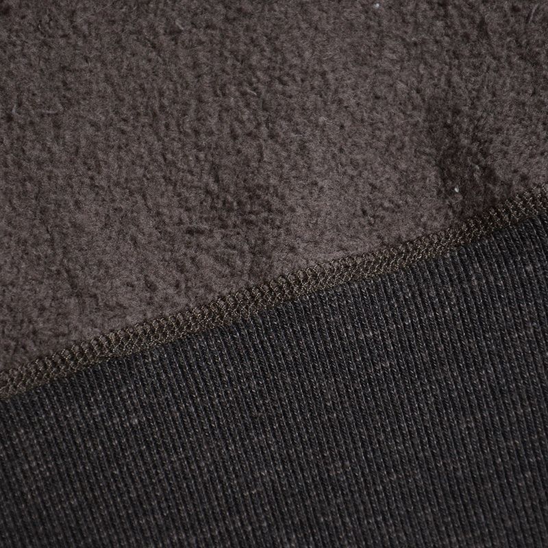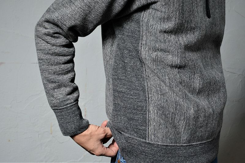 和歌山にて旧式吊編機により製造する吊裏毛素材。本来この旧式編機は「フワフワに柔らかく空気を含むように編み上げる特徴」を持ちますが、デラックスウエア企画では旧式吊編機に手を加え、最高密度で編み上げることでしっかりとしていながら突出した高保温性を得ています。またドライな手触りと着込む程に体に馴染む質感がデラックスウエアのオリジナル吊裏毛の特徴です。