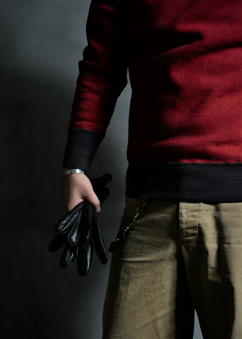 和歌山にて旧式吊編機により製造する吊裏毛素材。本来この旧式編機は「フワフワに柔らかく空気を含むように編み上げる特徴」を持ちますが、デラックスウエア企画では旧式編機に手を加え、最高密度で編み上げることでしっかりとしていながら突出した高保温性を得ています。またドライな手触りと着込む程に体に馴染む質感がデラックスウエアのオリジナル吊裏毛の特徴となります。