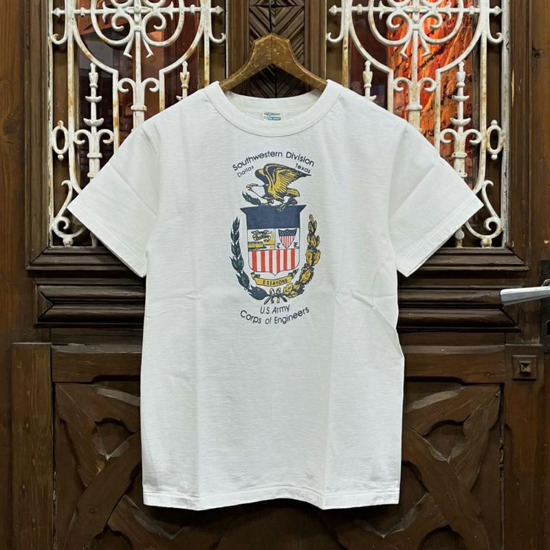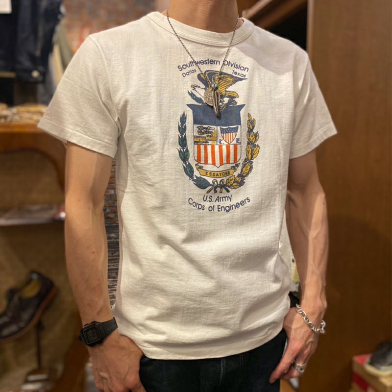 1960年代後半にアメリカで流通したTシャツ。吊編機で製造されたその素材は「薄くペラペラの厚さ」と「チープな雰囲気」が何かカッコよさを持っていました。そのチープなカッコ良さを「少しばかり品質向上したら」という企画で製造した素材がこの2018年から新登場したガス焼き吊天竺です。ですから、プリントデザインも1960年代後半を彷彿するような柄を製作しています。「色落ちしたジーンズにヤレて少しくたびれた雰囲気の丈夫なTシャツスタイル」これがこのMTGシリーズが目指すところです。