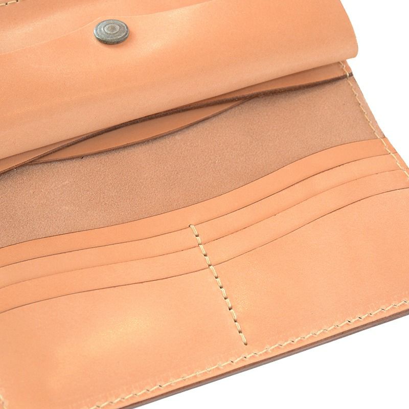 シンプルな二つ折りウォレットながら、ボタン開閉式の扱い易い小銭入れ、カード6枚+フリーポケットなど収納力も抜群。