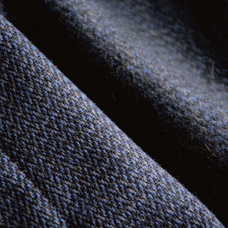愛知県一宮市にて製造するウール+コットン素材。ウールを用いた組織では、メルトンやラッセル編みが有名ですがこのオリジナルウール素材は平織り組織を変形させカタチにした非常に稀な素材です。また、ニュージーランドとブルガリアの異なる素材感のウールを混ぜ合うことで、独特の質感(手触りと見た目)を創り上げています。経糸に綿番手でいう8番を二本撚り合わせ、緯糸には4番単相当の極太糸で織り上げた唯一無二の素材です。