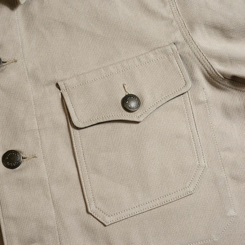 兵庫県西脇で製造したピケ素材を使用したジャケット「ノバック」。1910sフレンチハンティングジャケットを基にスタイリッシュにリプロダクトしたドレス&ワークジャケット。芸術的な新素材「スワローピケ」や独特のカタチなど、アンティークテイスト溢れる1着。