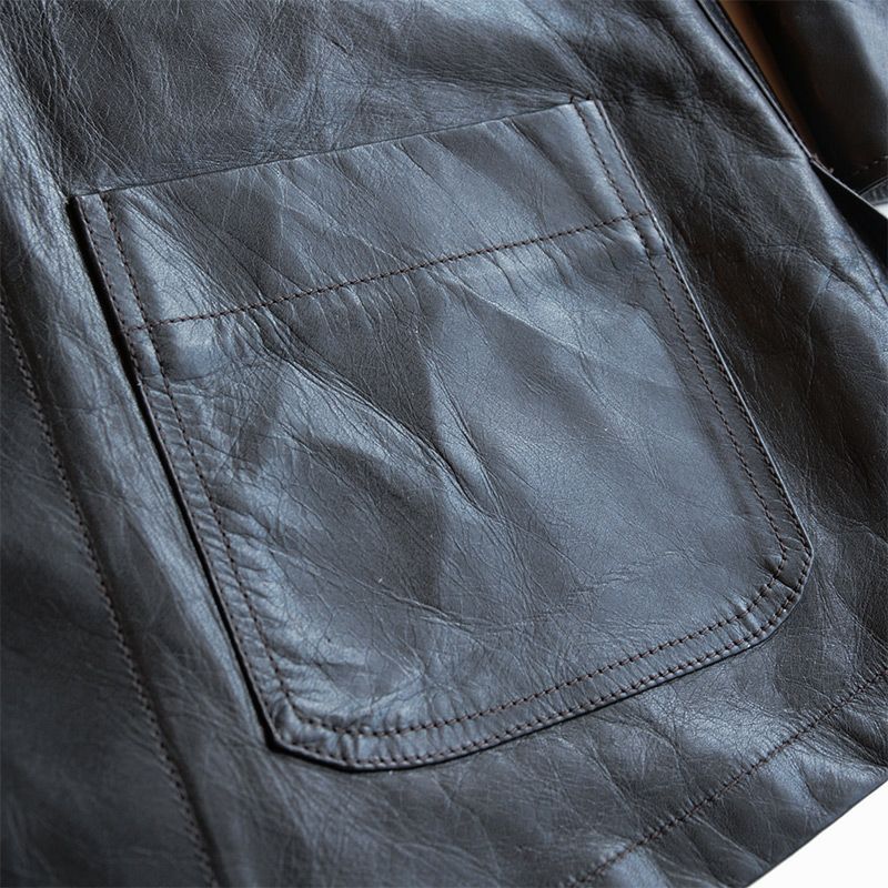 シャツとジャケットの融合を謳い、Pコートのダブルボタン・前立て合わせを特徴に持つこのレンジマンの馬革タイプとして製造。「一枚仕立て(裏地無し)」というコンセプトを持つことからレザーであっても一枚革使用コンセプトを変更することなくカタチにすることが目標でもありました。革の床面(バックスキン)の毛羽や繊維カス付着を抑えるため、染料と熱による特殊圧着をオリジナル開発してまで加工した経緯がこのコンセプトに由来します。ウエストラインがありながら丈の長いジャケットスタイル、Pコートと同様のダブルボタン、そして前後差を付けた立体形状のアームホールなど、オリジナル形状が特徴です。