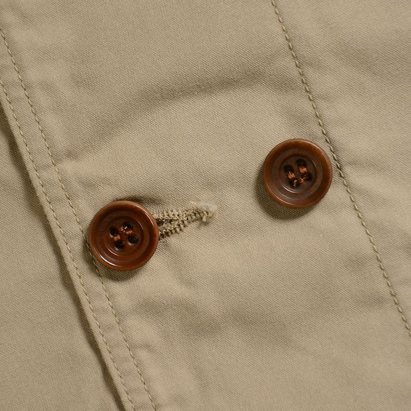 1900年代初頭から存在するポプリンと言うファブリック。この生地は出世魚のような考えで捉えて頂くと分かり易いと思われますが、「織り糸を細くして(100番単糸前後)高密度で平織りしたタイプライター」、「織り糸を中細にして(40番単糸前後)高密度で平織りしたポプリン」、「織り糸を太くし(30番単糸前後)高密度で平織りしたウエザー」、「織り糸を更に太くし引き揃えて平織りしたダック(密度は様々)」など、糸の太さや密度によって名称が異なります。今回製造したオリジナルポプリンは、「織り糸40番2本撚り合わせ(太くして)して限界高密度で平織りしたポプリン」です。ウエザーとポプリンの中間に位置し、厚みとハリとコシ、限界密度による防風性が特徴です。このような利点から過去ミリタリーに多く使われて来た機能性高く面白いポプリンファブリック、素材の観点から向き合っても面白いのではないでしょうか。