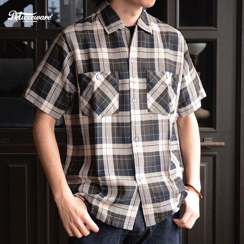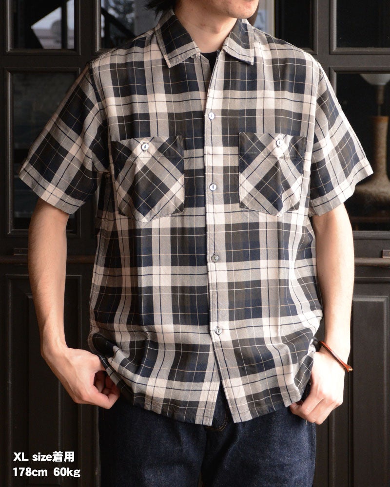 RAYON100%による希少な引き揃えオックス織りの半袖チェックシャツ