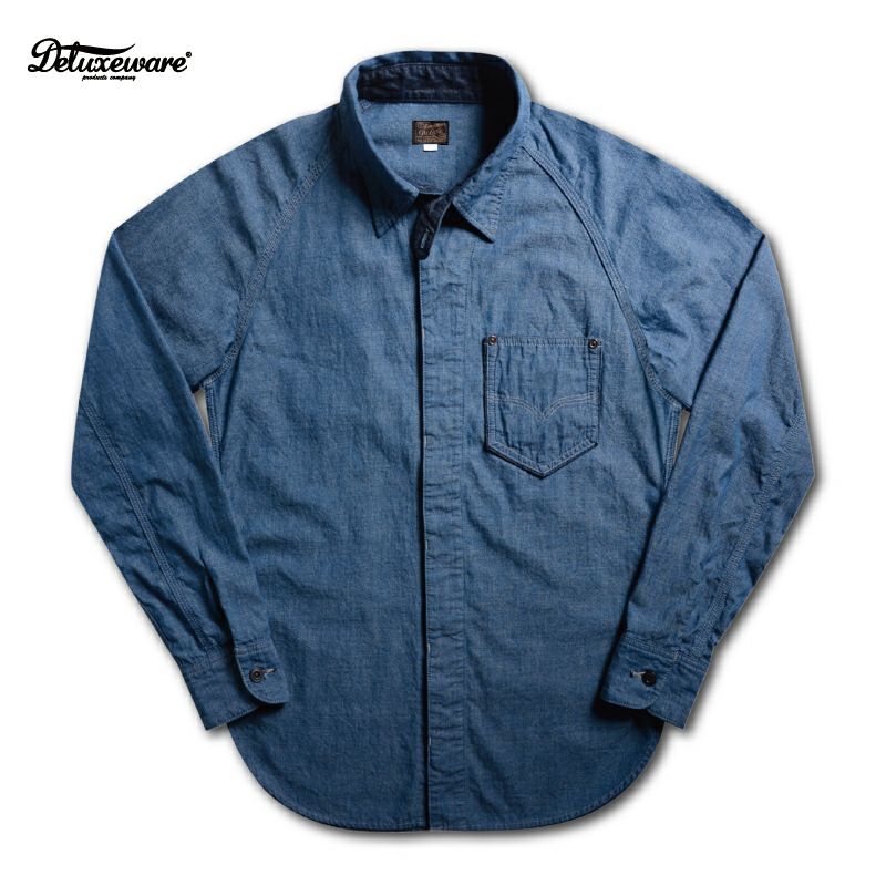 岡山県井原で織り上げたオリジナルインディゴシャンブレーを使用したデラックスウエア人気の7640シャツタイプ。デラックスウエアだけのカタチと素材をタイトショートシルエットで合わせるジーンズとの相性がとてもいい瞬間限定シャツです。