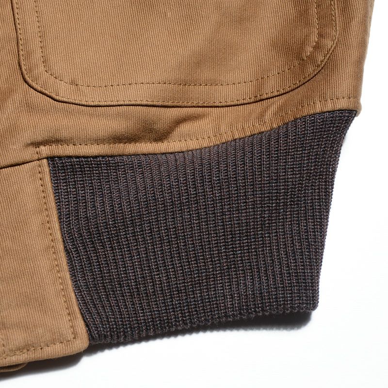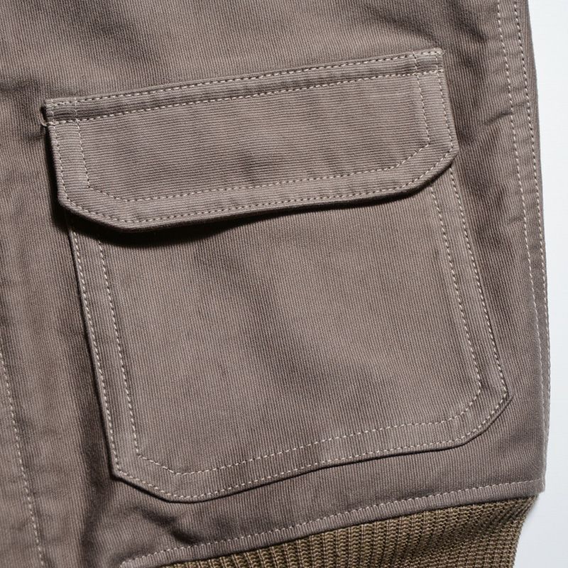 イタリア産の成馬(生後3年以上経過した馬)を収集し、兵庫県姫路にて仕上げました1.4㎜厚ホースハイドです。クロム鞣しを行った後にクロムを抜き、更にタンニン鞣しを行う特殊2工程鞣しによって仕上げ、表面を色染めしたリアルな茶芯(革内部が茶色)品質が特徴です。また、静岡県浜松で製造した高密度コード織り素材、編み糸3色を組み合わせて1/1アゼ編みで製造したフライスなど、見所満載の素材がバランスよく組合せられた1着。