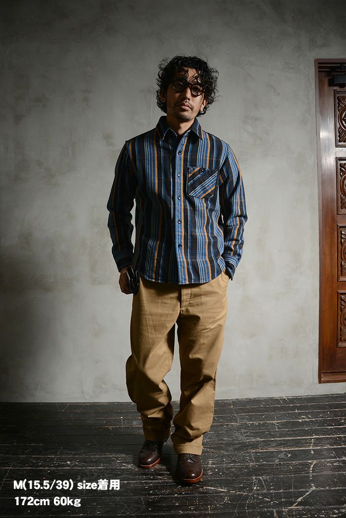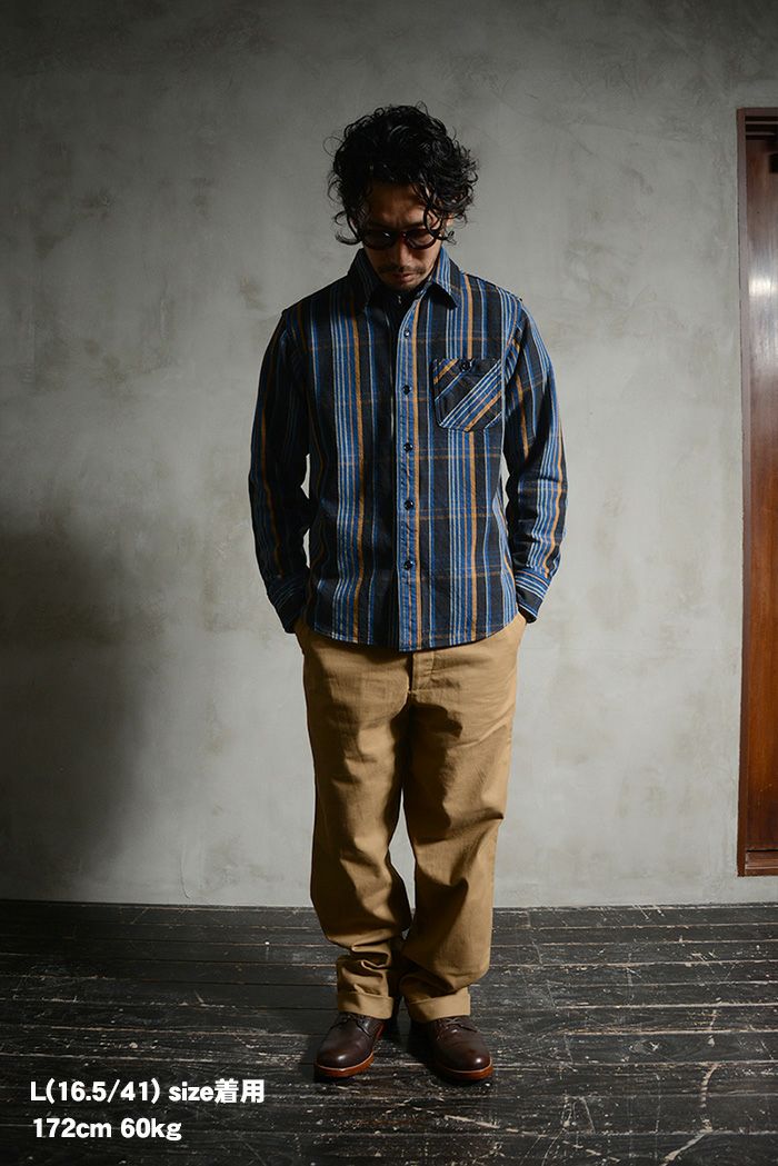 新潟県見附の旧式織機を使用し織り上げたヘビーネル素材。経糸に空紡糸10番2本を撚り合わせた双糸を張り、緯糸にも同様に空紡糸10番撚り合わせた双糸を打込み製造したヘビーネル生地は、厚みがありながらガッシリとしたドライ感な質感と、裏地に施した限界深起毛によってフワフワな着心地が融合しています。2022年秋冬は希少かつ珍しい柄での提案です。
