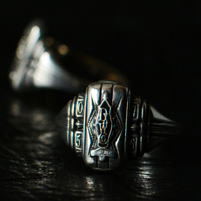 1956年のカレッジリングを基にし製造しました。中心には「DXWCO」の文字、中心下部には「DELUXEWARE」を入れ、台座を囲む4方には「0576」の文字入り。