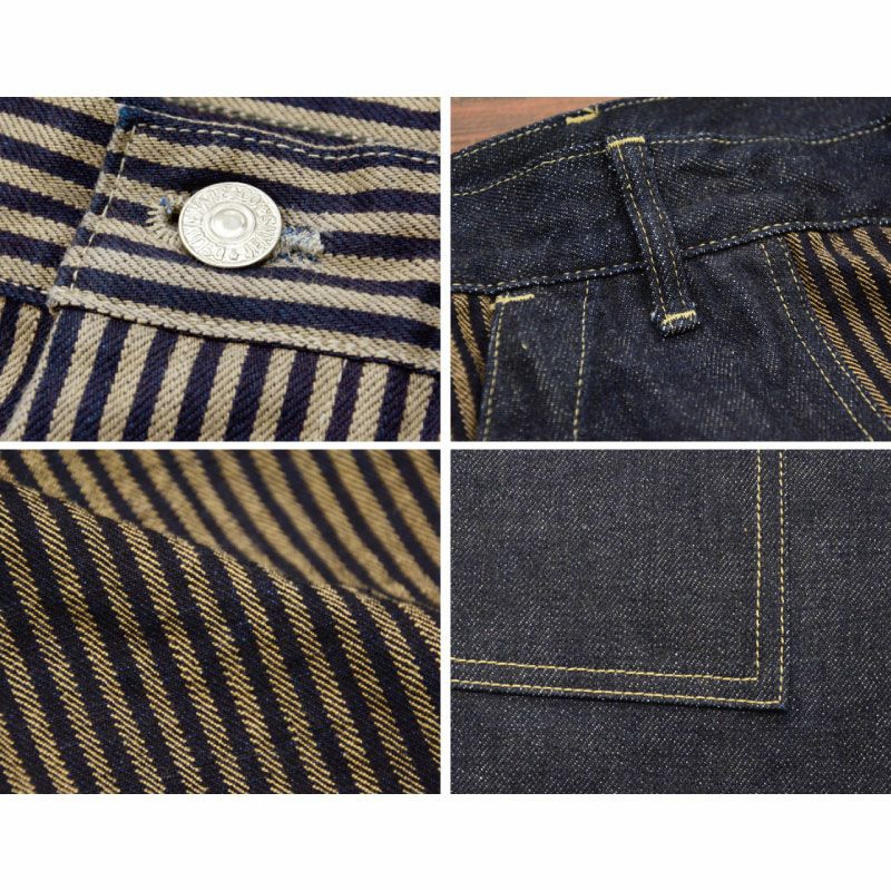 13.6ozのオリジナルヒッコリー生地は硫化染色で染めることにより深みのある色を創出した。着用後はベージュとインディゴが同時に色落ち、経年変化を見せることで独特の風合いを生み出す。またインディゴ色は、着用後もハリコシ感を保つ13ozオリジナル炭インディゴデニム。アメリカメンフィスコットンとでんぷん糊による当時の手法、インディゴに油煙炭を混合しその後の酸化という特殊な工程を経ることによりオールドブルーを引き出している。